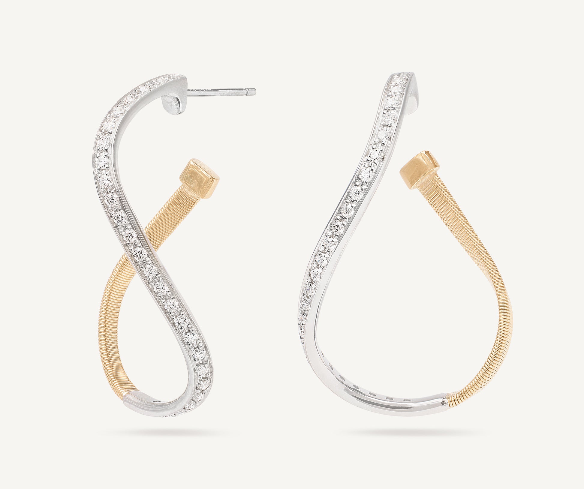 Subtle, elegant and full of finesse, these 18kt yellow gold hoop earrings feature a striking twisted coil into an irregular infinity shaped hoop and embellished with pav�� diamonds. Perfect for adding a touch of light to any outfit.