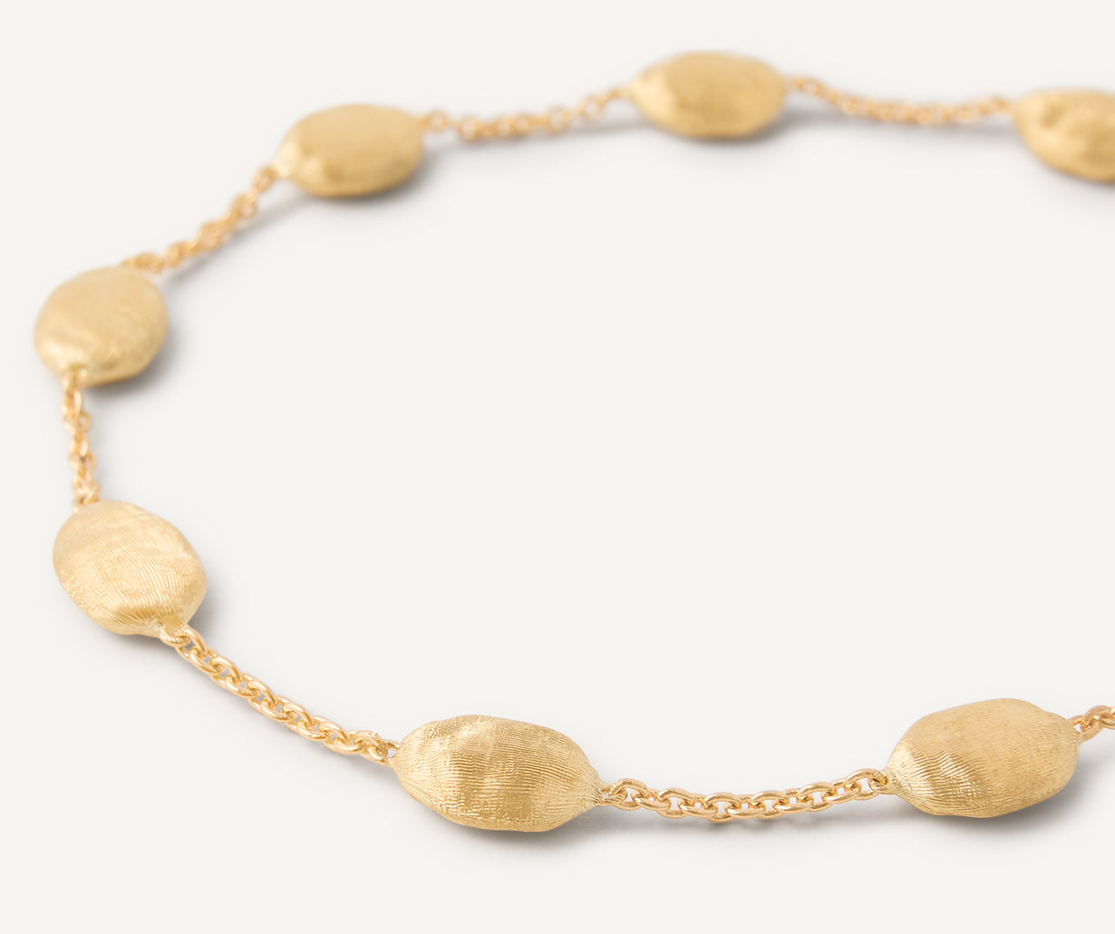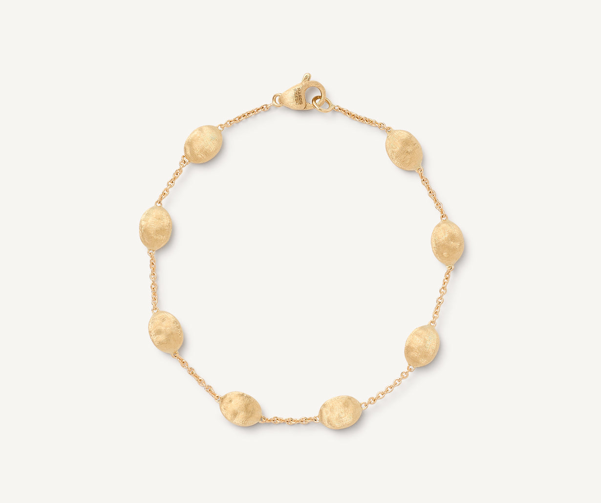 Light and delicate, this bracelet features tiny oval elements in 18kt yellow gold with an irregular surface, finely hand-engraved using an ancient Florentine technique.