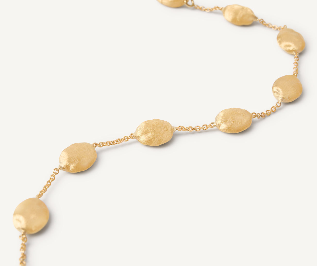 Elegant and timeless, this bracelet alternates a slender chain with oval elements in 18kt yellow gold with an irregular surface, finely hand-engraved using an ancient Florentine technique.