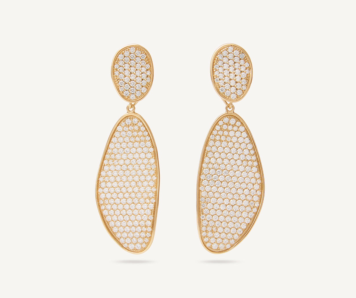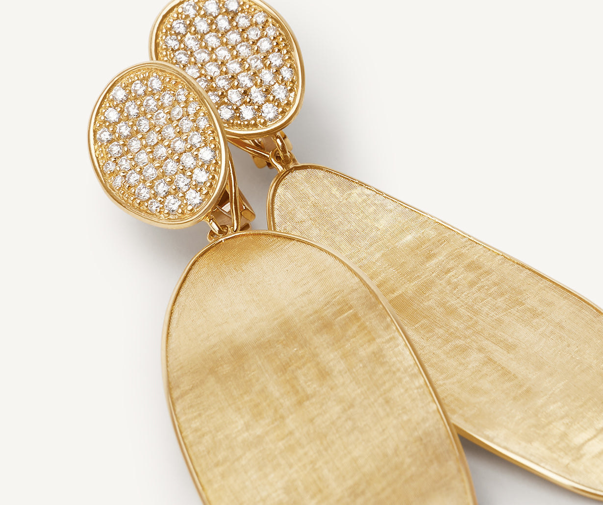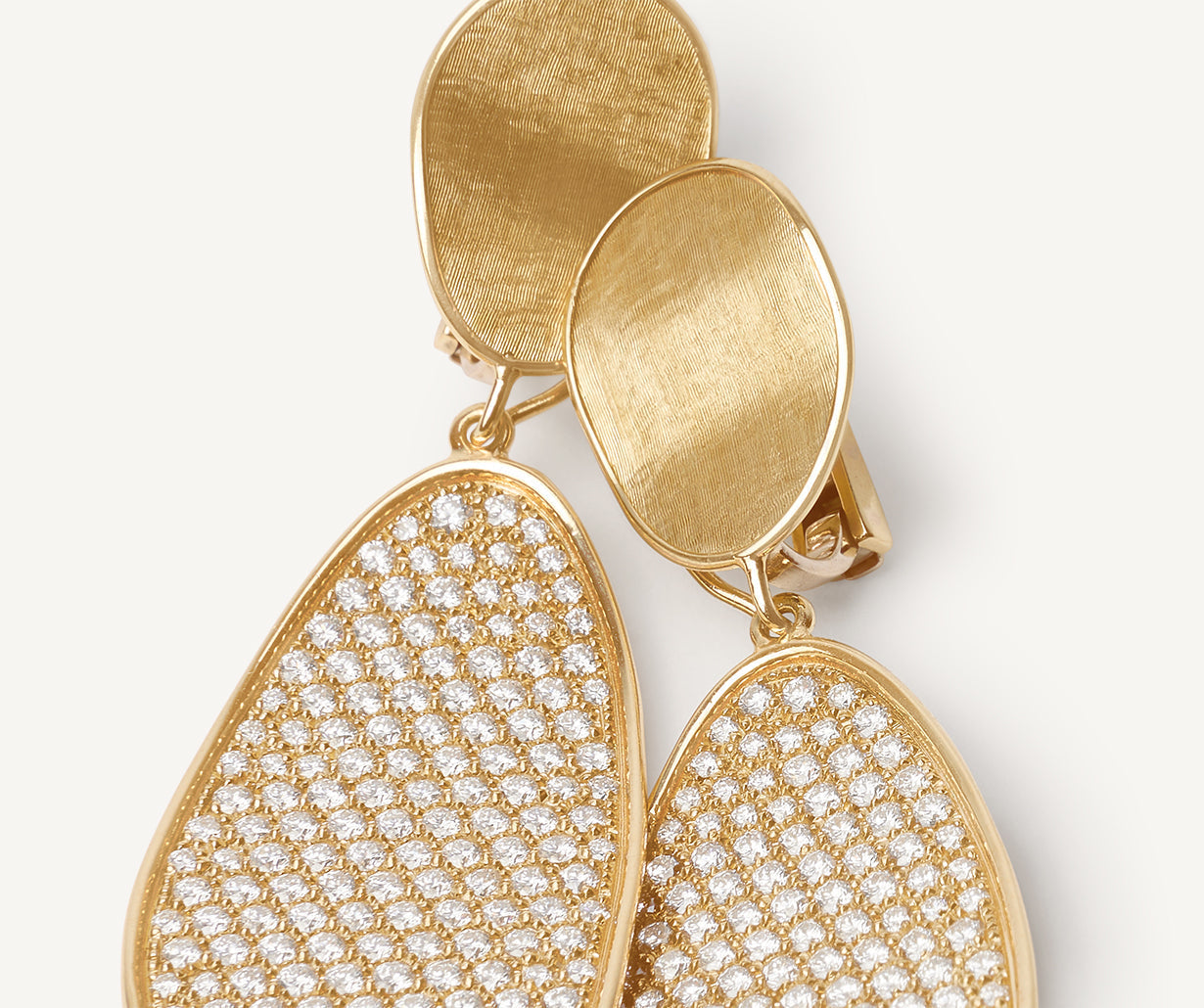 Illuminated by the romantic and feminine touch of pav�� brilliant-cut diamonds, these convertible earrings can be worn in as many as six different combinations by simply detaching and mixing the pendant elements. The 18kt yellow gold leaves are finely hand-engraved using an ancient Florentine technique.