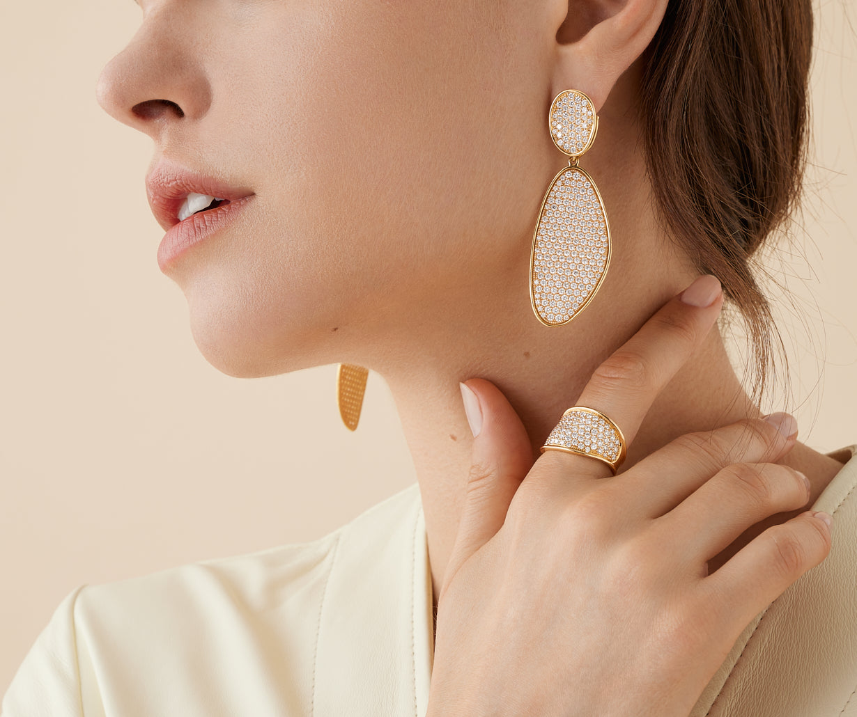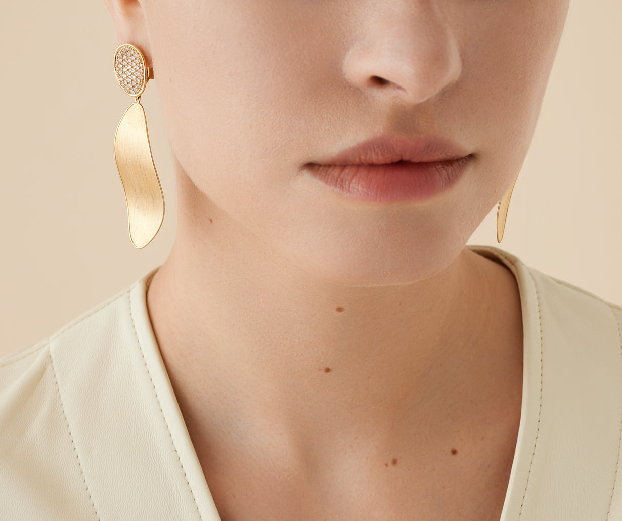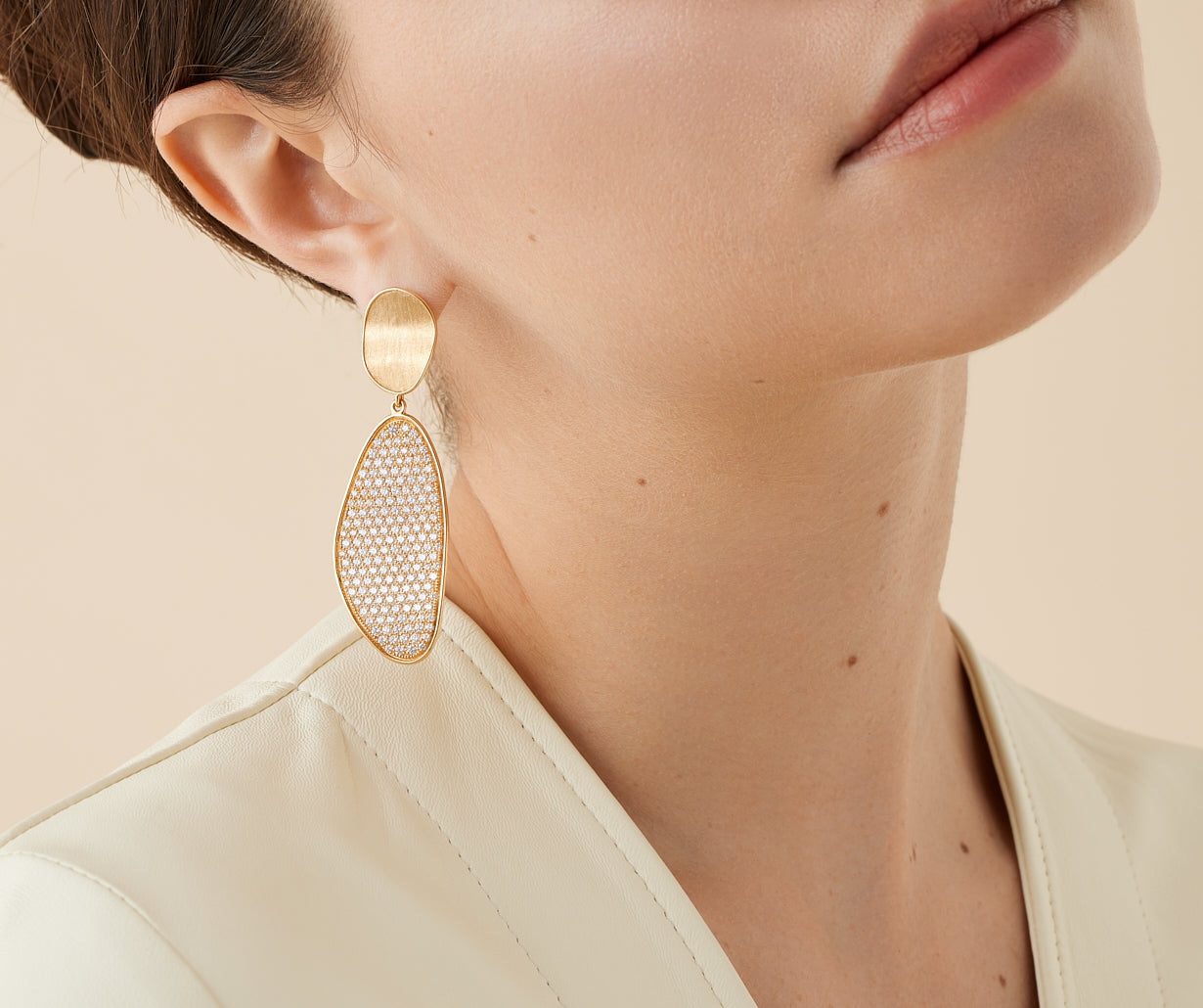 Illuminated by the romantic and feminine touch of pav�� brilliant-cut diamonds, these convertible earrings can be worn in as many as six different combinations by simply detaching and mixing the pendant elements. The 18kt yellow gold leaves are finely hand-engraved using an ancient Florentine technique.