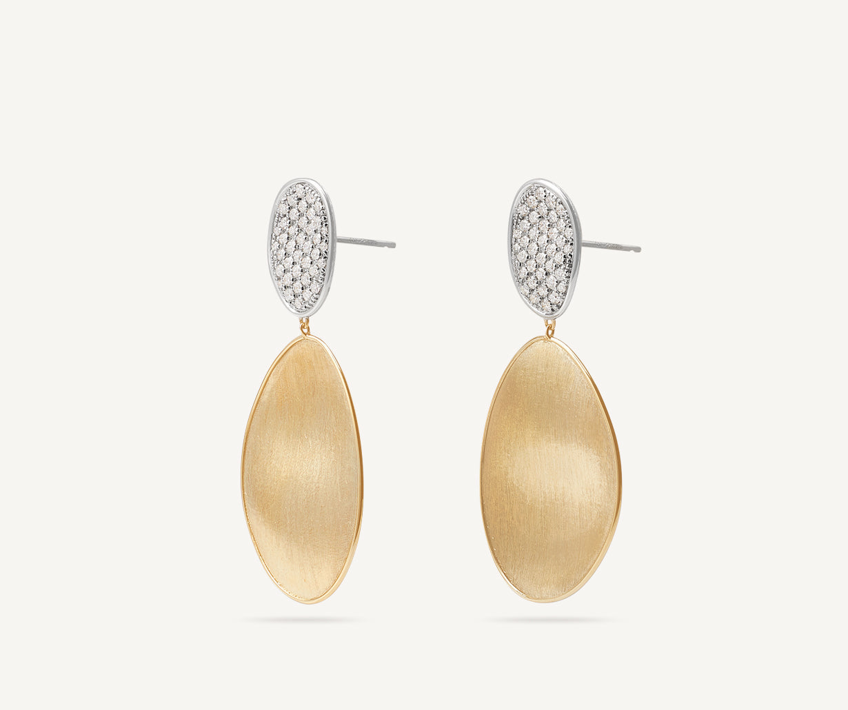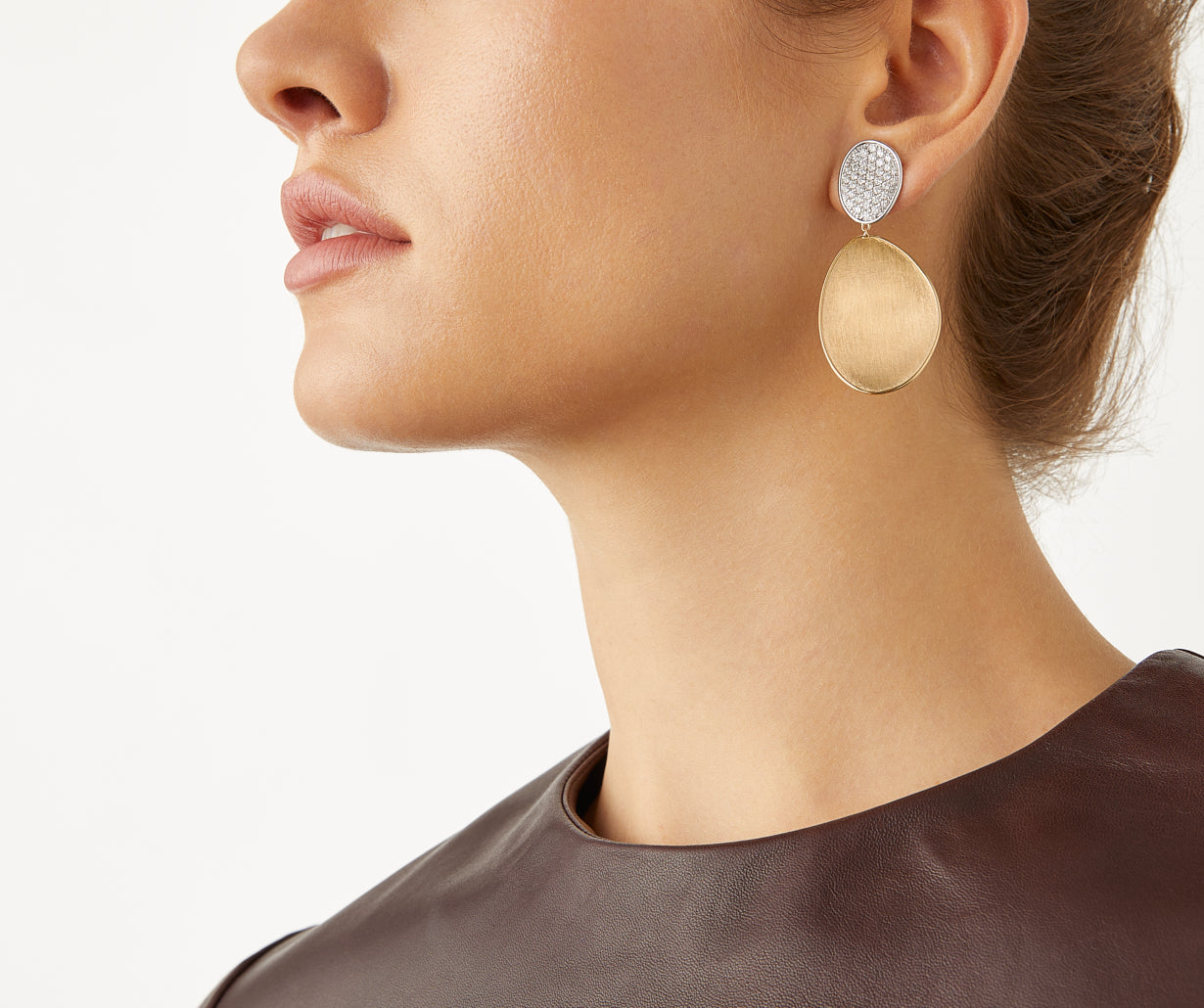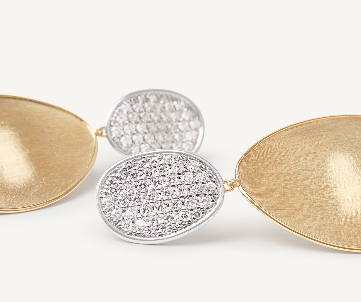 18kt yellow gold leaves, finely hand-engraved using an ancient Florentine technique, are embellished by a brilliant-cut diamond pav��, making these chandelier earrings an iconic element of the collection that stand out for their elegance and refinement.