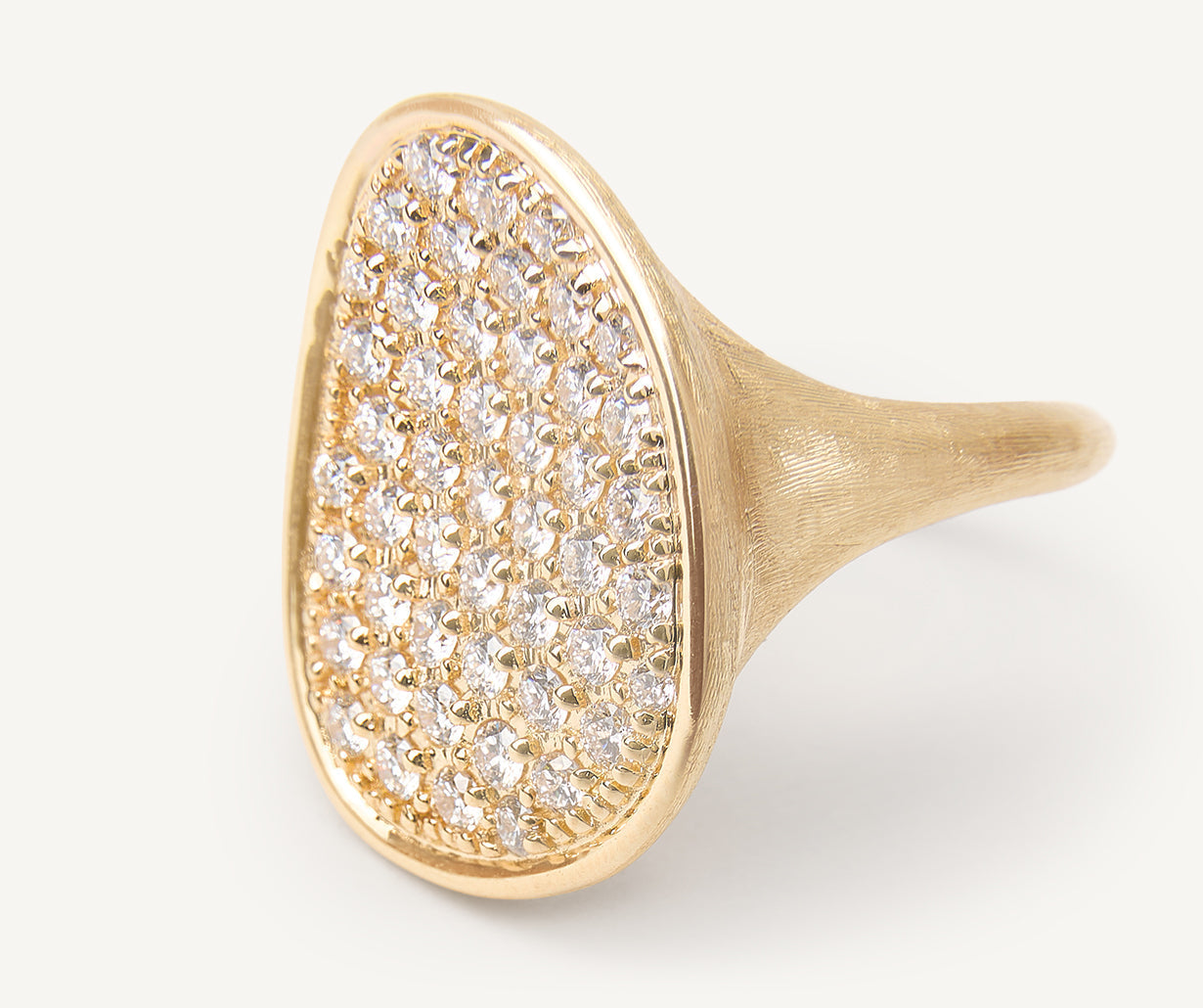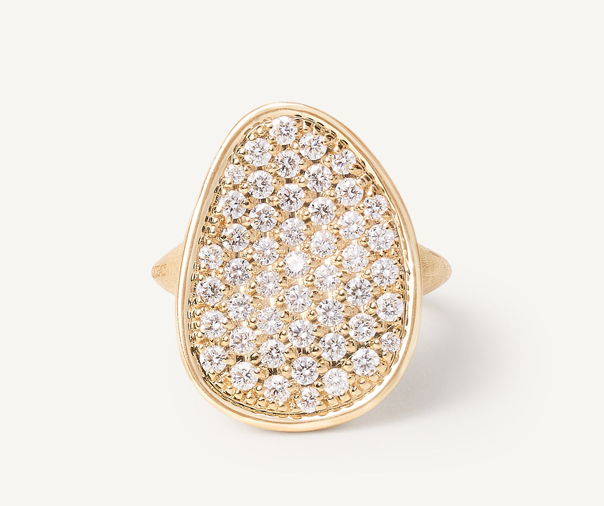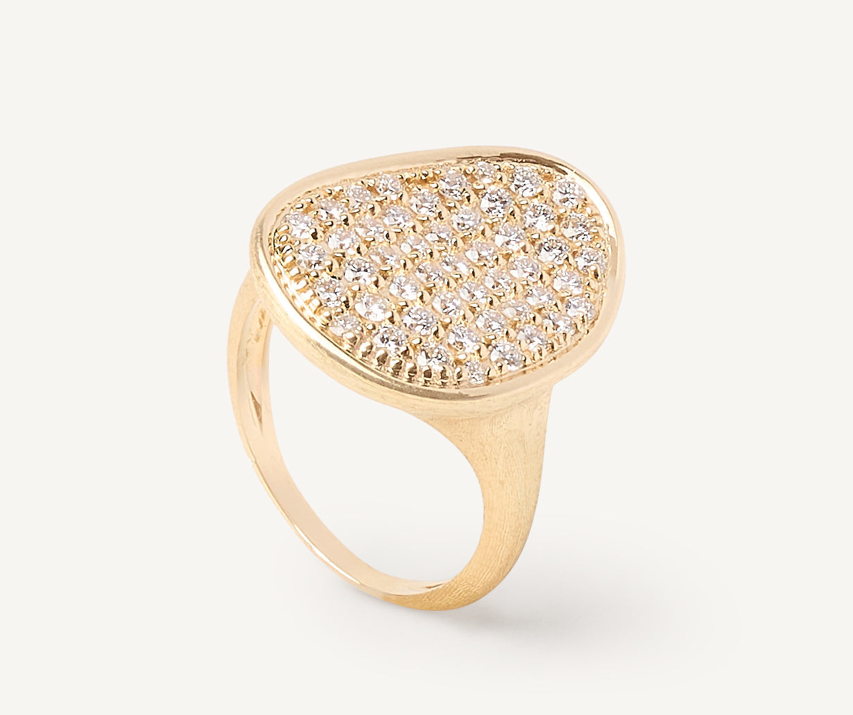 An elegant leaf-shaped brilliant-cut diamonds pav adorns this delicate 18kt yellow gold ring, making it even more precious. The gold is finely hand-engraved using an ancient Florentine technique.
