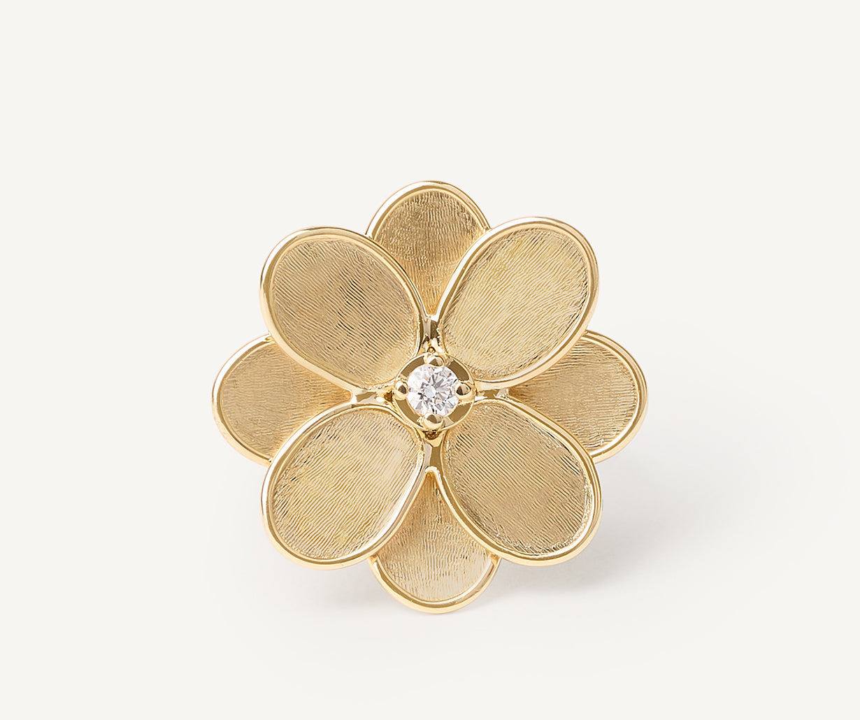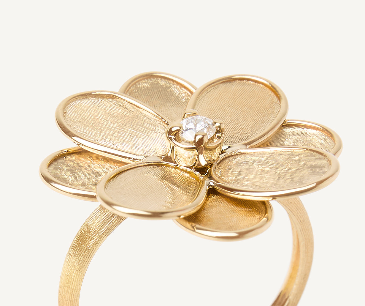 18kt yellow gold petals, finely hand-engraved using an ancient Florentine technique, envelop a precious brilliant-cut diamond. A romantic ring with a design inspired by nature, a delicate balance of shapes and volumes.
