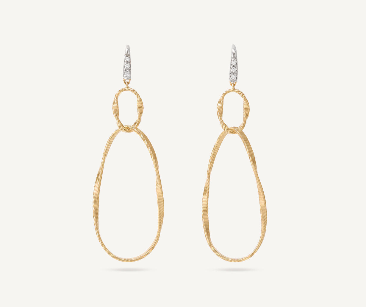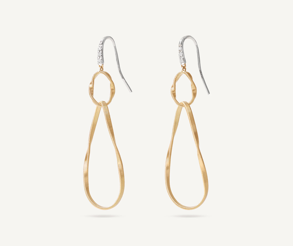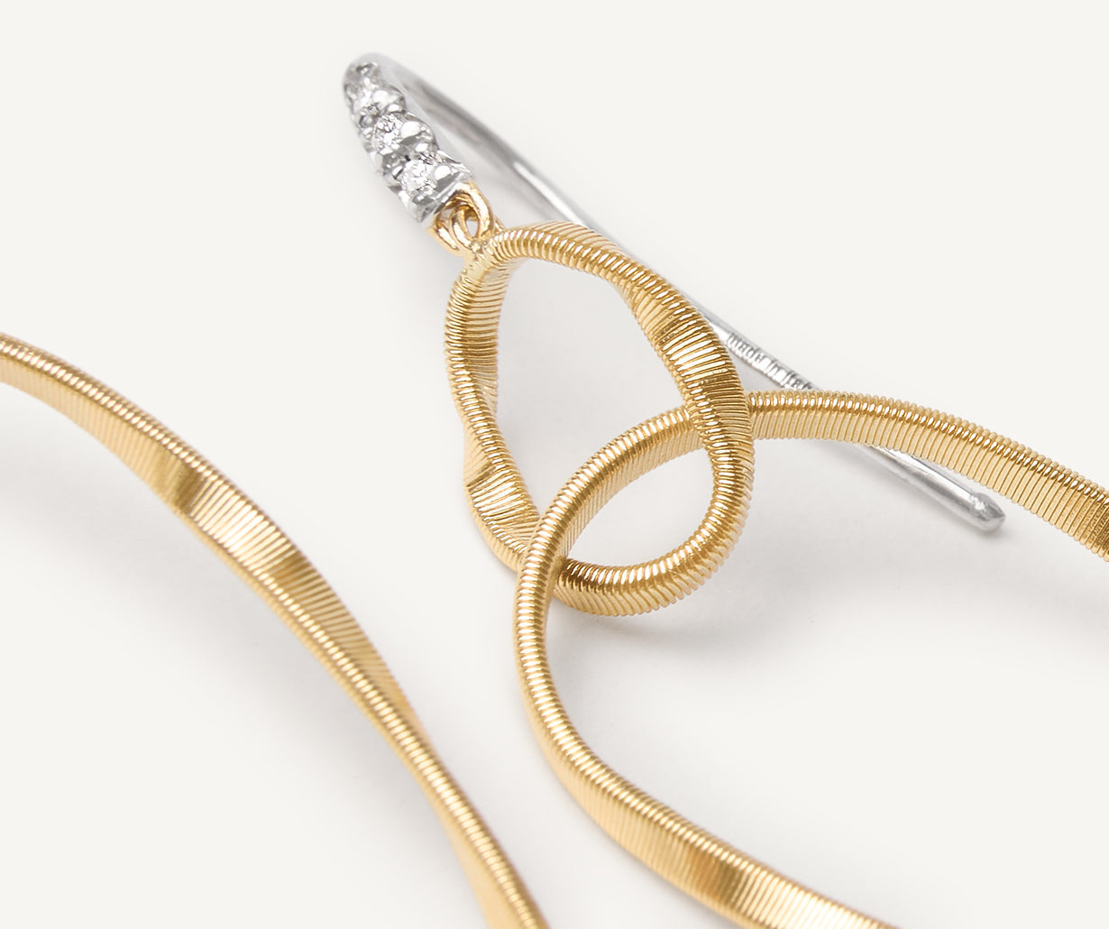 Two oval twisted coils interlink in a minimalist design in this 18kt yellow gold earring embellished by a precious hook featuring a brilliant-cut diamond pav��.