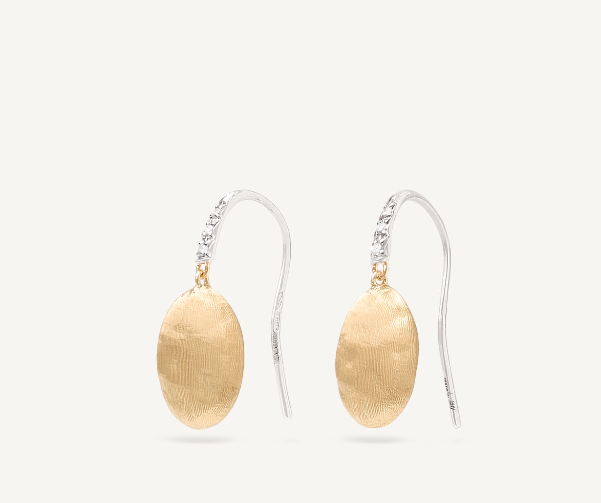 These 18kt yellow gold earring boast an understated, timeless elegance. A pav�� hook of brilliant-cut diamonds embellishes a small oval with an irregular surface, finely hand-engraved using an ancient Florentine technique.