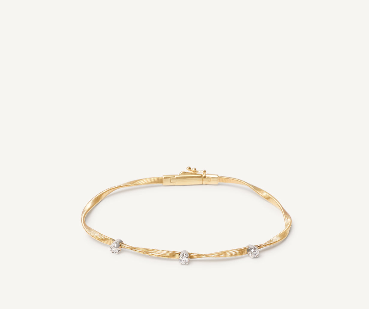 An elegant strand of twisted threads in 18kt yellow gold, crafted with the artisanal coil technique, embellished by three brilliant-cut diamonds. Perfect on its own or matched with the other Marco Bicego jewels. An extraordinary style statement.
