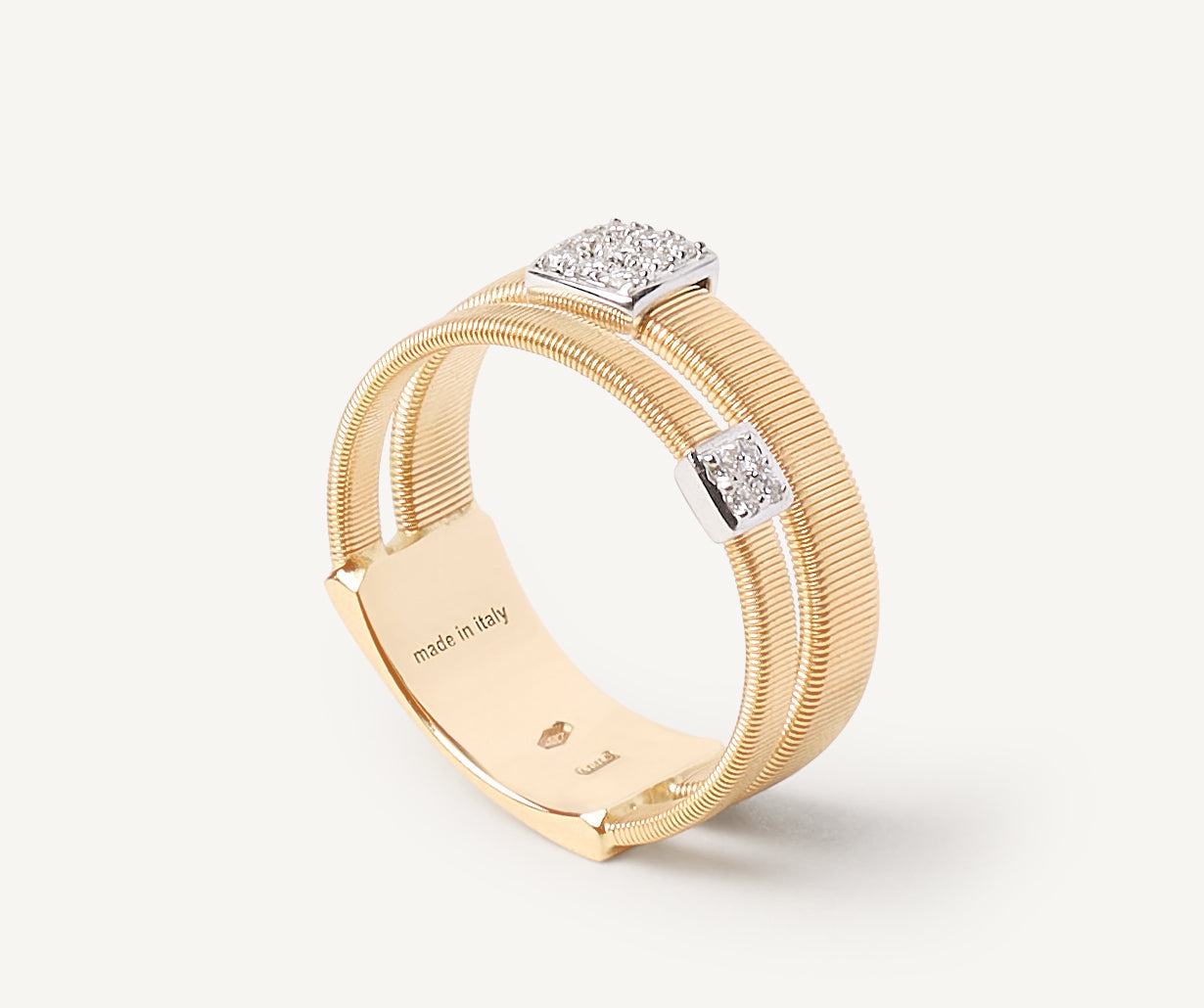 Featuring two parallel flat coils, each embellished by a brilliant-cut diamond pav, this 18kt yellow gold ring blends a contemporary design with timeless elegance.