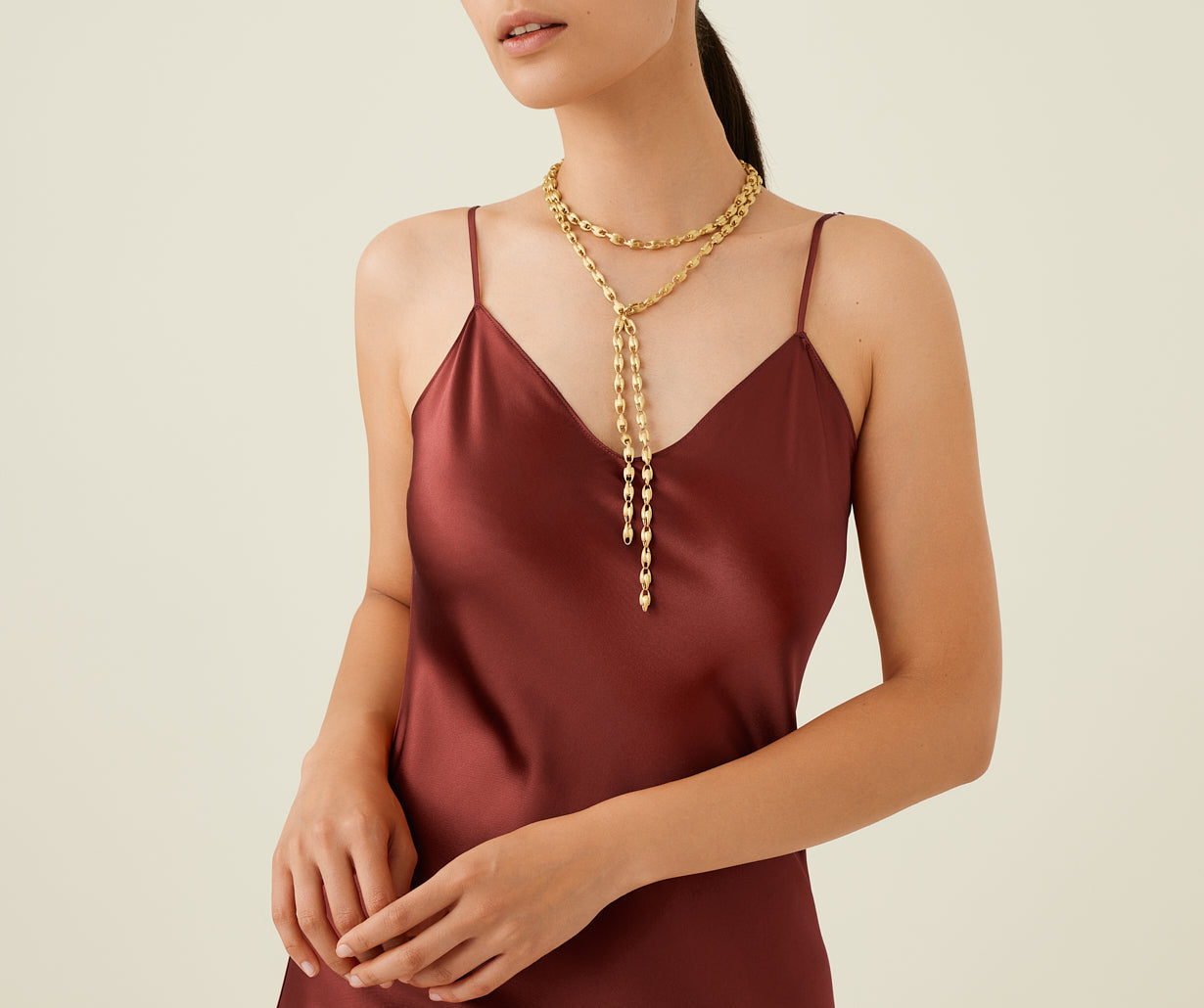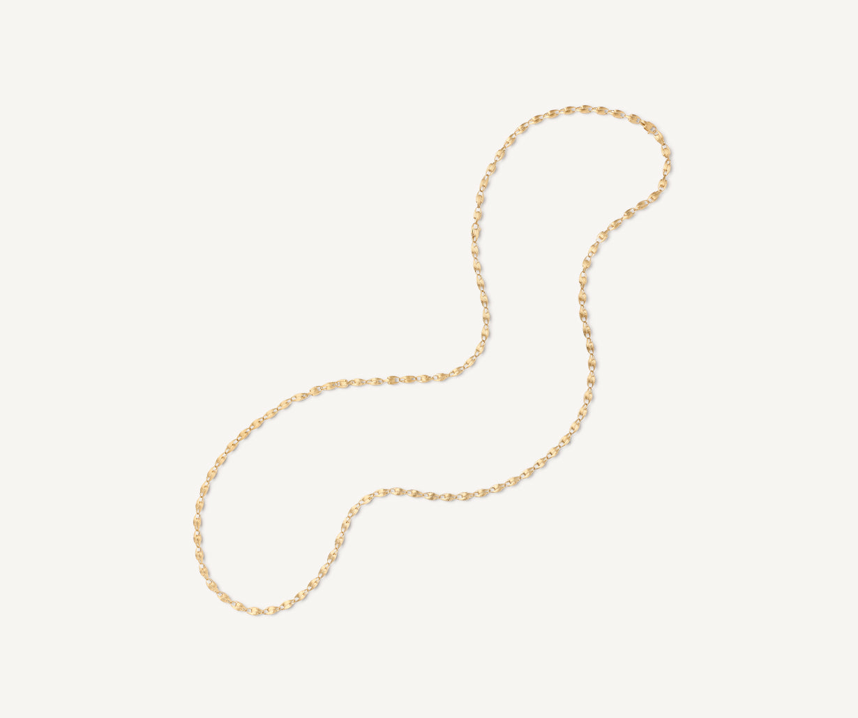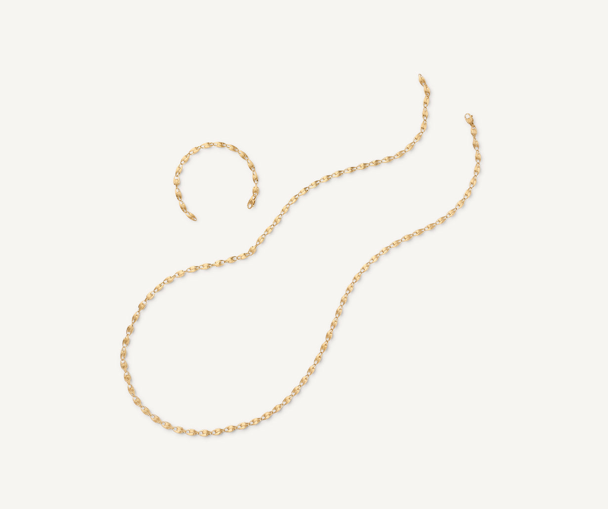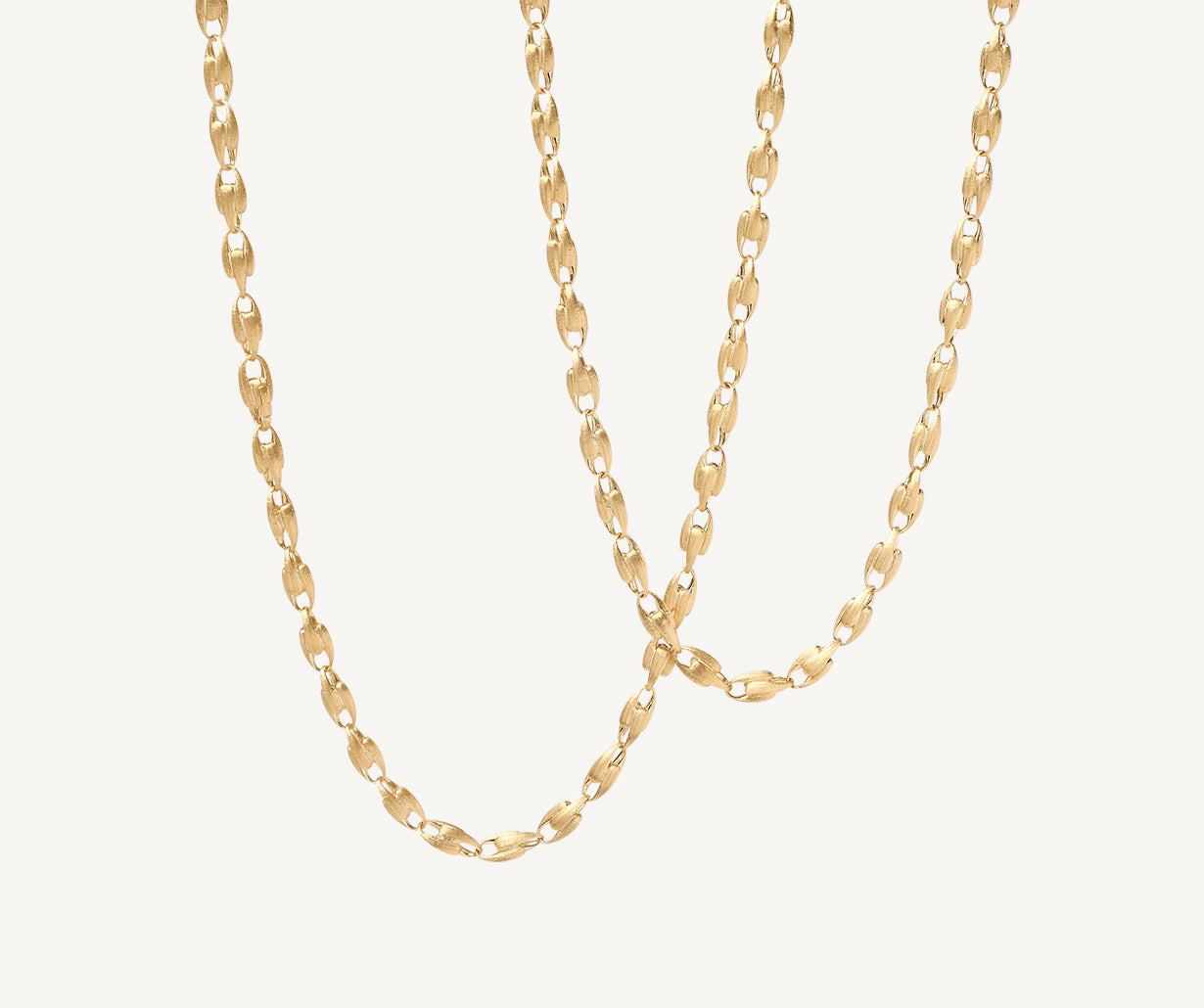 One necklace, two clasps, twelve ways to wear it. This extraordinary chain, featuring a series of linked elements that come together in an endless embrace, is an extremely versatile jewel: crated in 18kt yellow gold and finely hand-engraved using an ancient Florentine technique, it has a perfect length for all combinations. The double clasp also makes it possible to wear it as a bracelet.