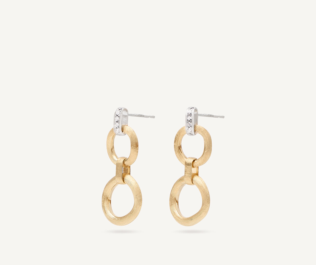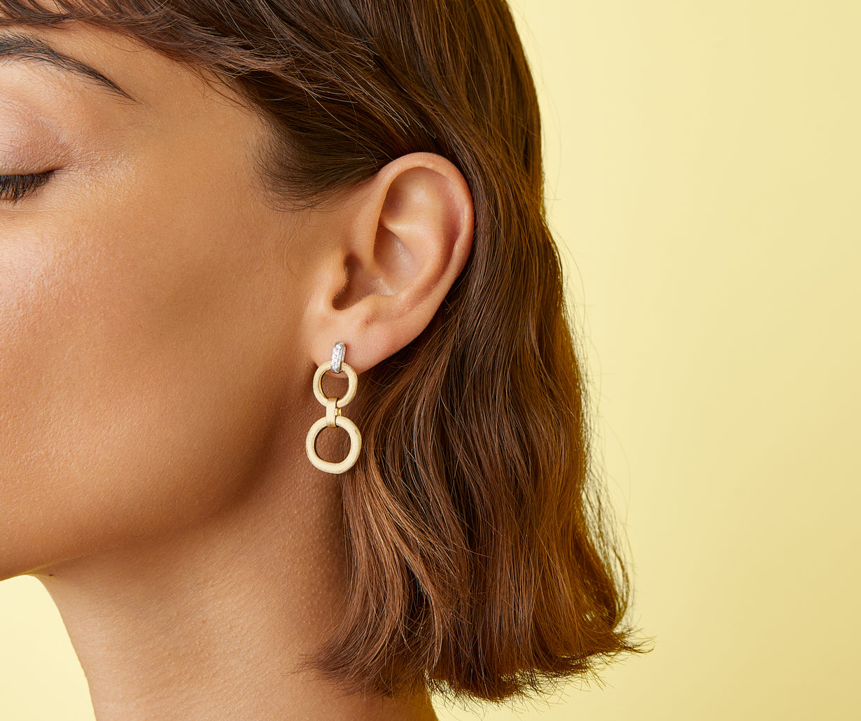 These earrings are characterised by sophisticated and captivating irregular circles in 18kt yellow gold, finely hand-engraved with an ancient Florentine technique. A brilliant-cut diamond pav�� adds a sublime sparkle.