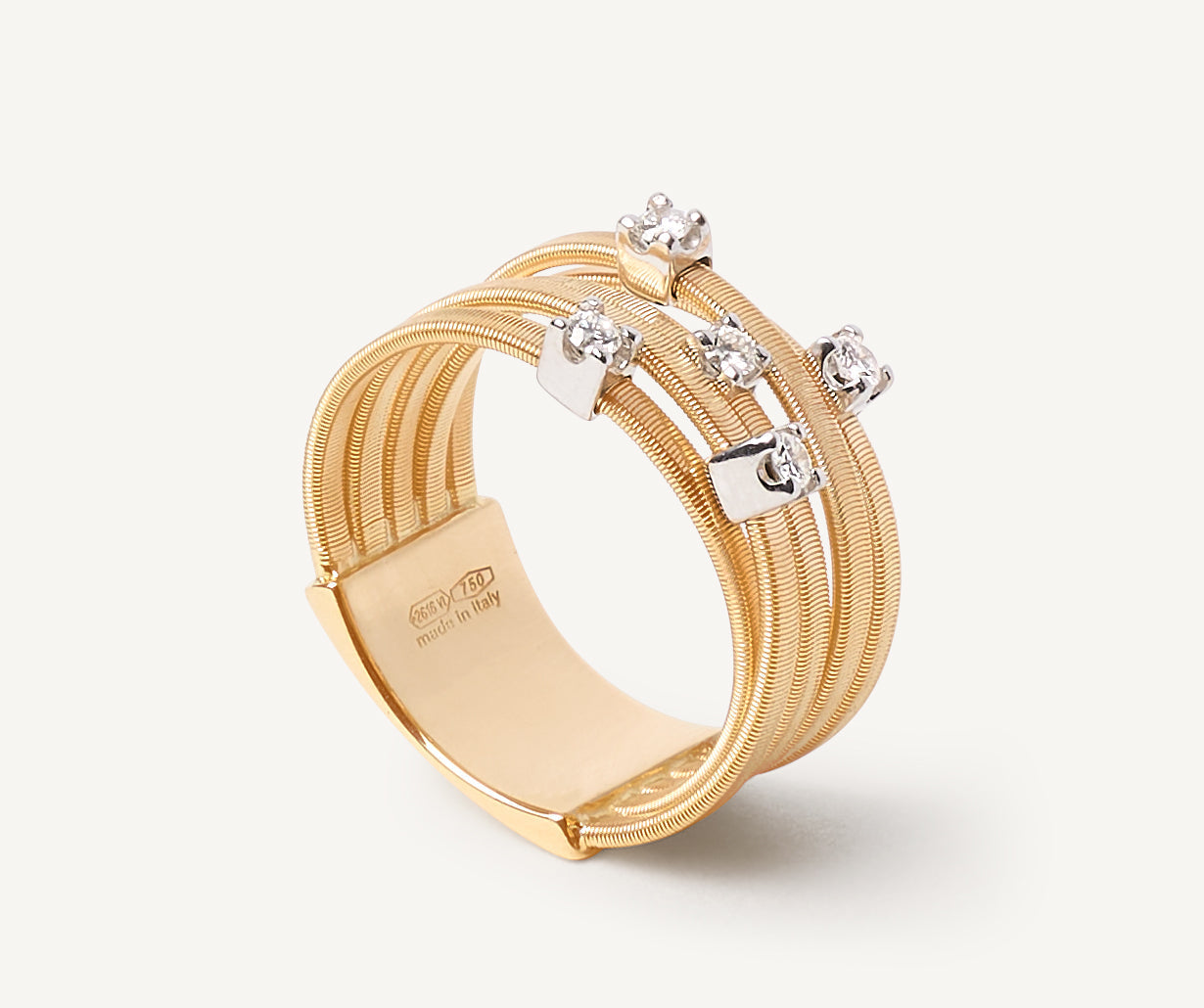 This sophisticated, 18kt yellow gold ring features five intertwined, flat spiral threads, carefully created with the exclusive coil technique. Embellished with a shower of brilliant-cut diamonds, it is a ready-to-wear jewel of timeless elegance.