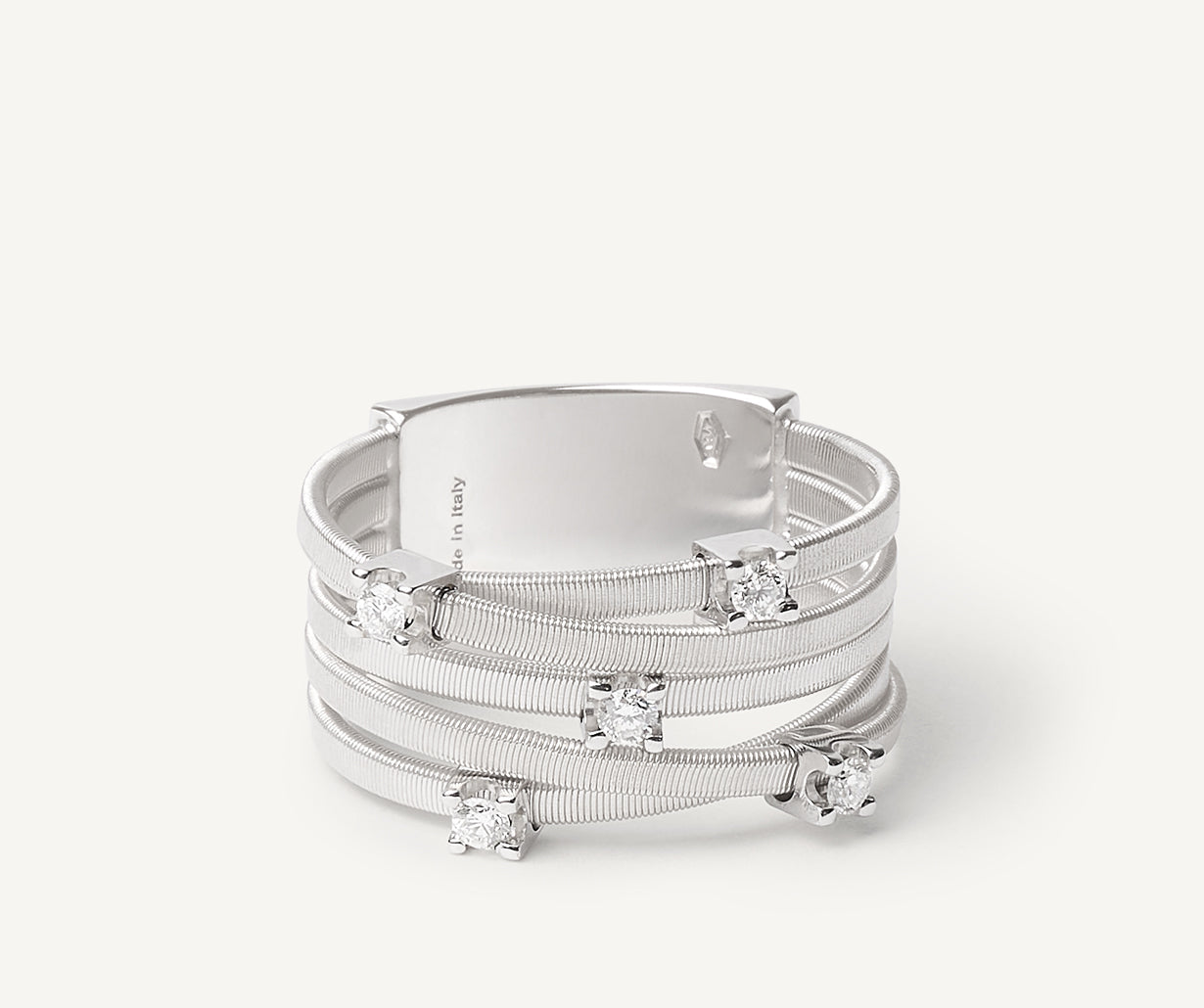 This sophisticated, 18kt white gold ring features five, intertwined, flat spiral threads, carefully created with the exclusive coil technique. Embellished with a shower of brilliant-cut diamonds, it is a ready-to-wear jewel of timeless elegance.