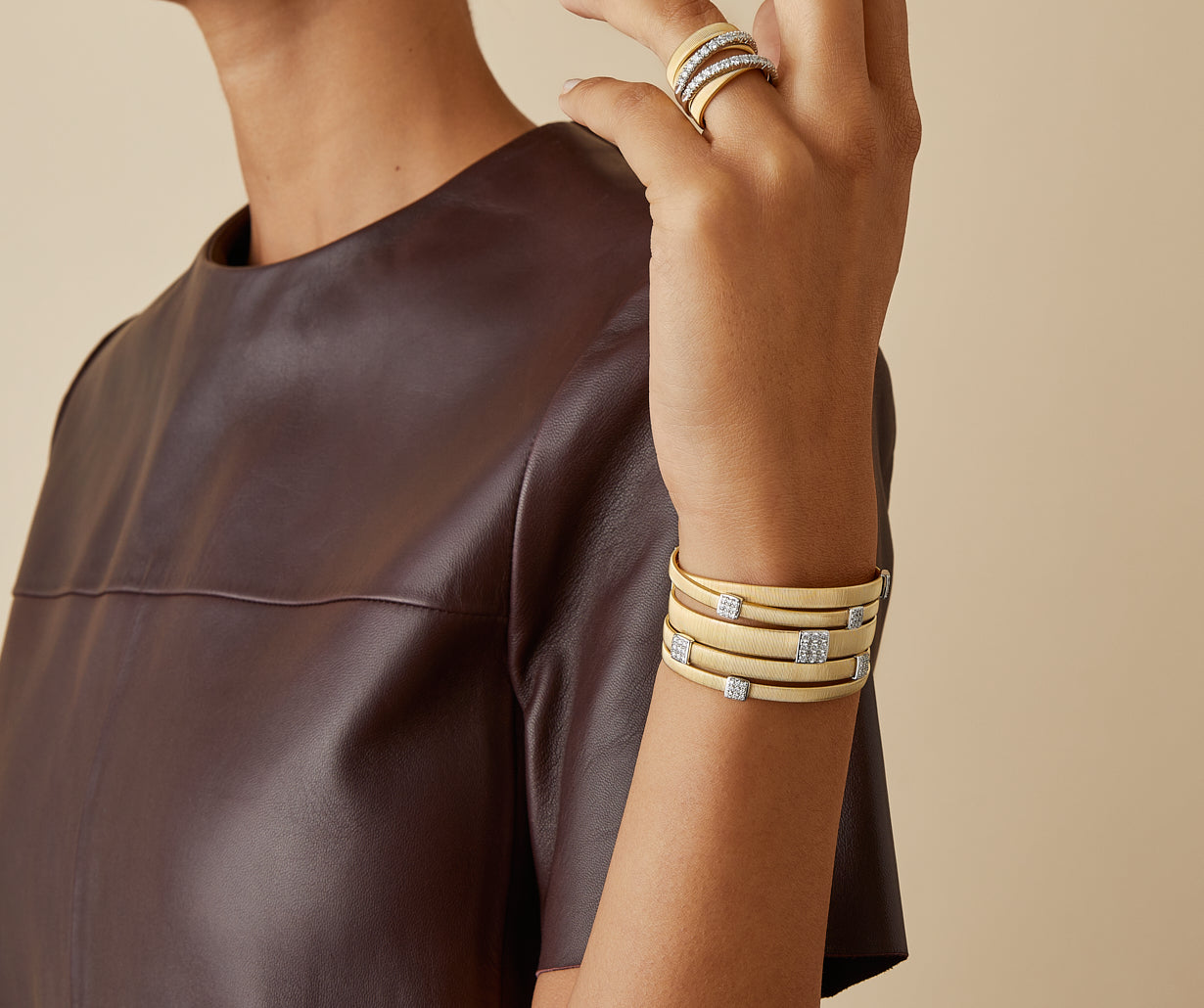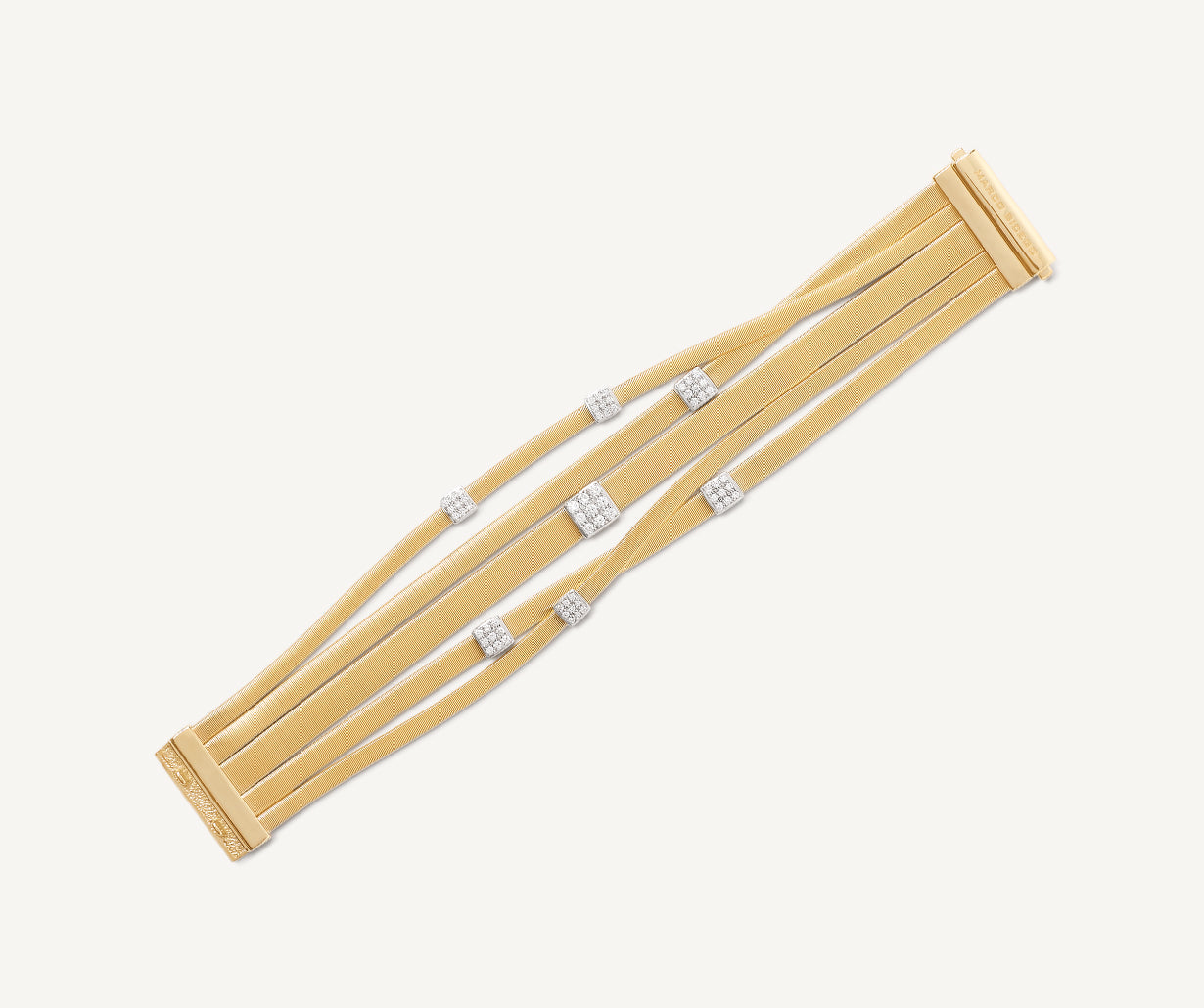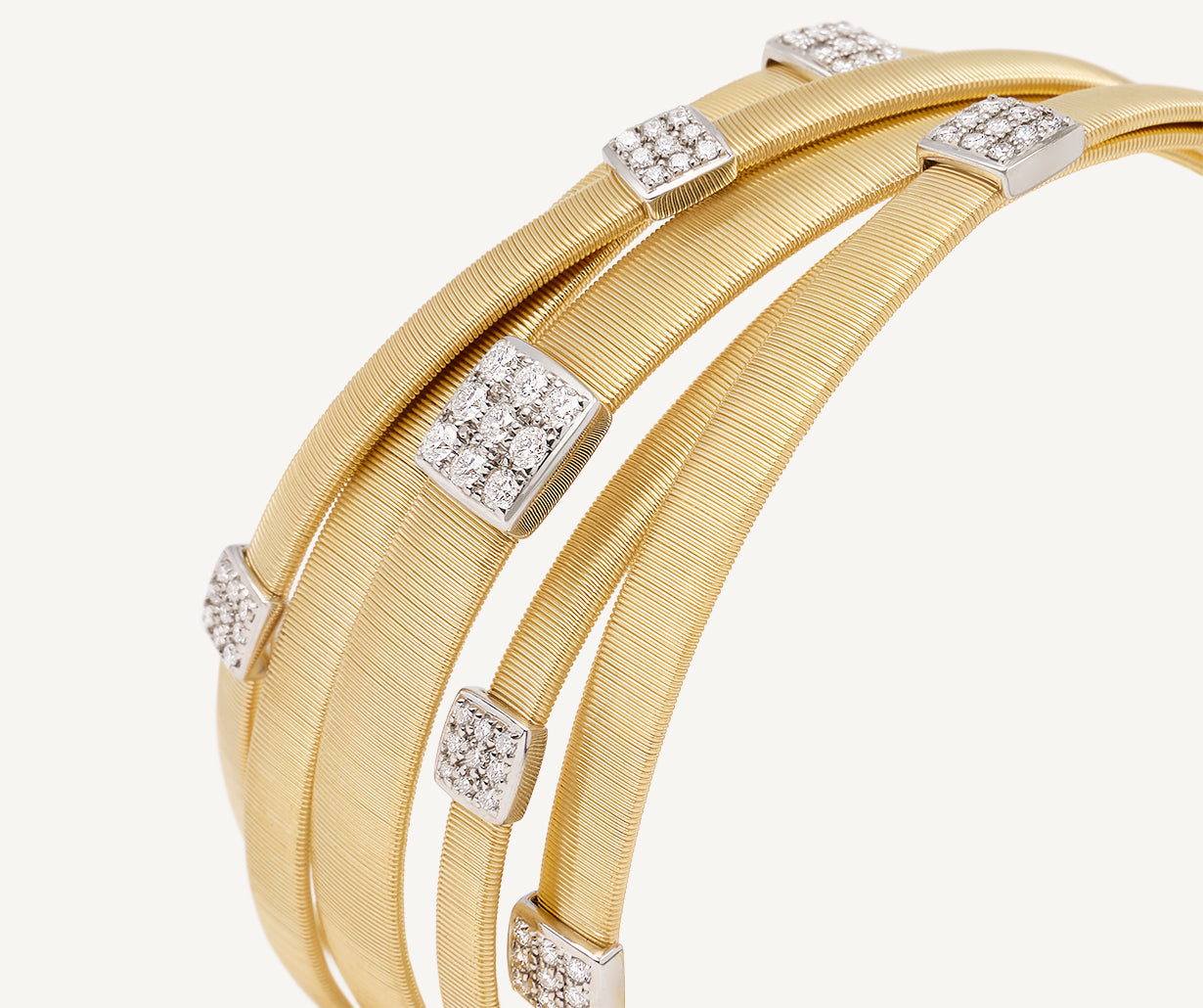 This beautiful, multi-strand, bracelet is characterized by the bold elegance of its twisted threads, carefully created with the exclusive coil technique. Crafted in 18kt yellow gold, it features brilliant-cut diamond paves and stands out for its unique wearability and volume as it envelops the wrist, making it a true icon of style.