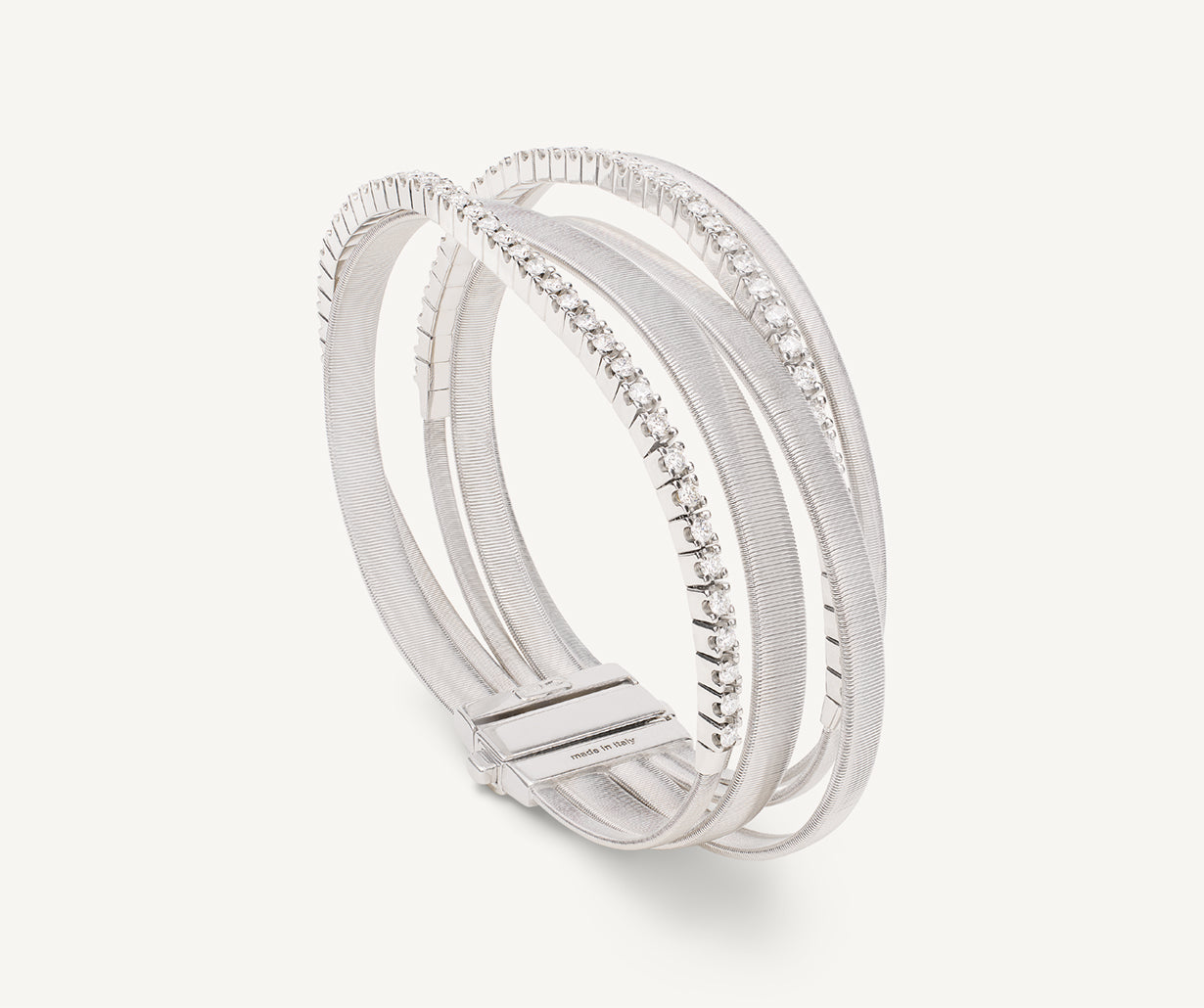 A wonderful 18kt white gold five-strand flat coil bracelet, made by exclusive coil craftsmanship, and two-strand diamond tennis. With a soft and stunning fit, it is a piece of jewelry that any woman would want on her wrist.
