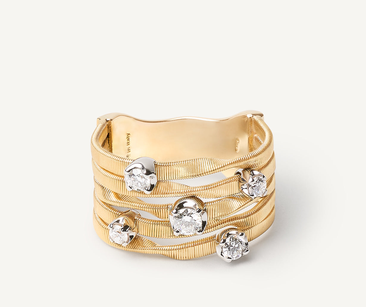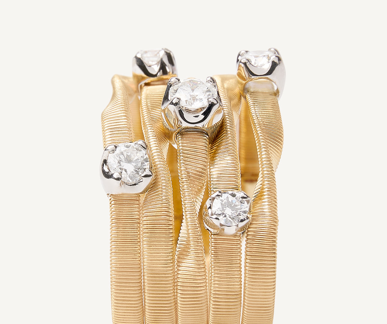 Elegant multi-strand ring in coil work. This jewelry, in 18kt yellow gold, mounts five brilliant-cut diamonds. Sophisticated, and timeless, it is a true must-have.