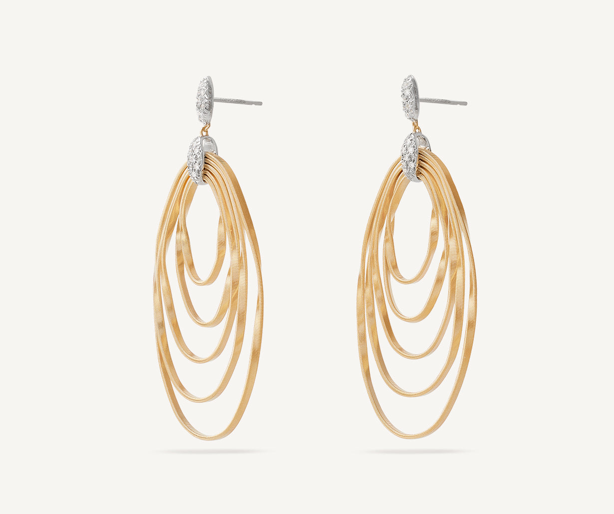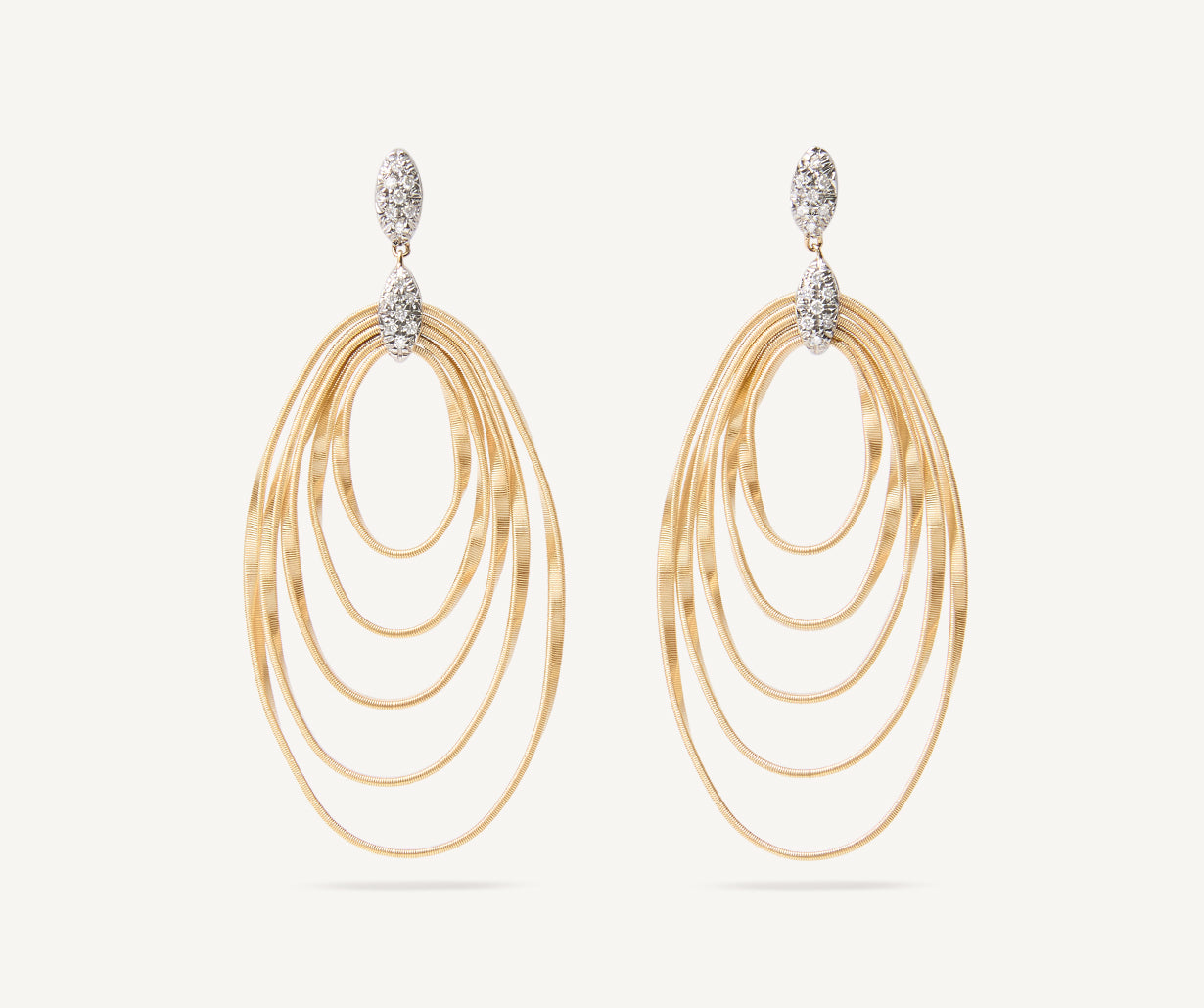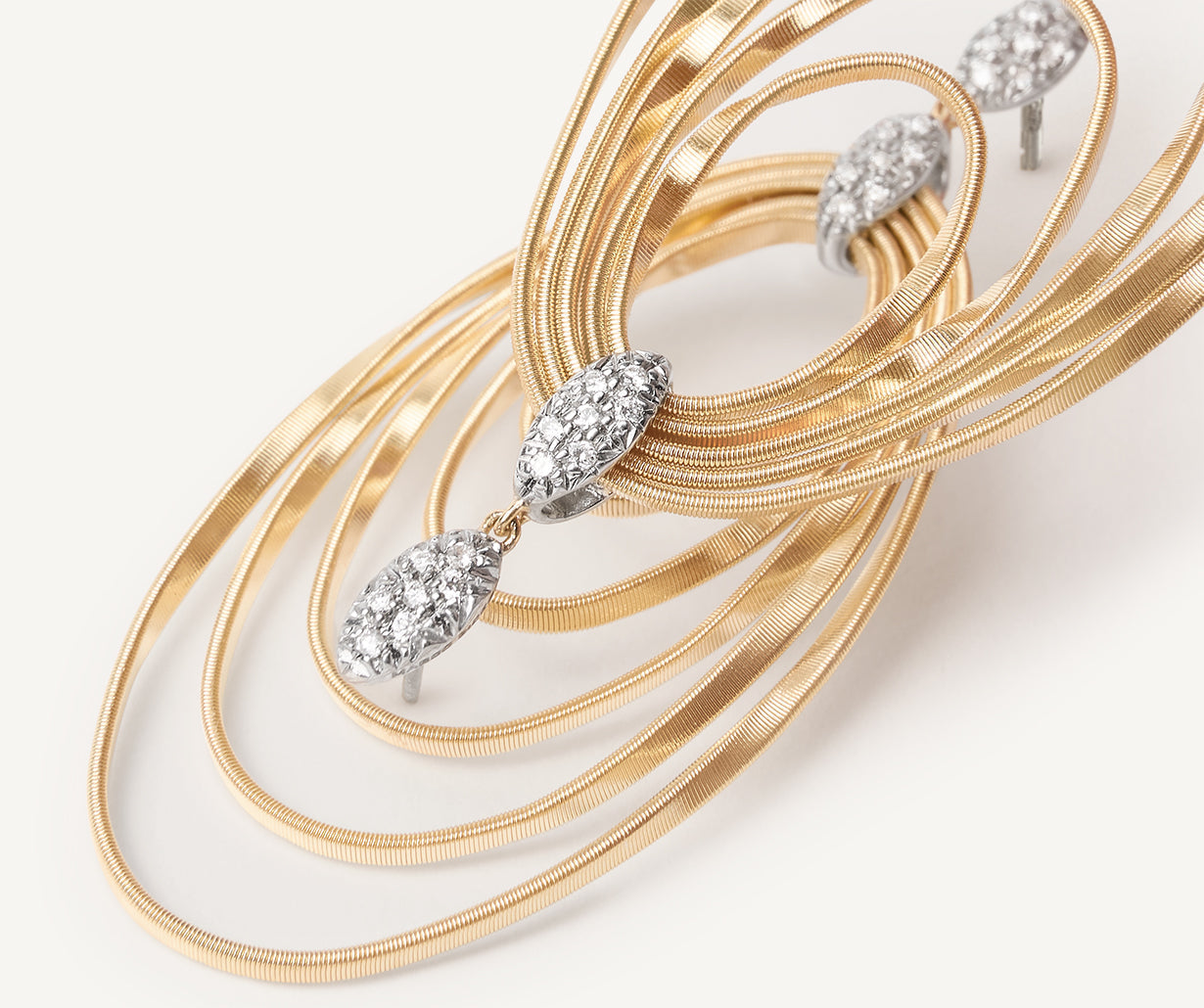 An iconic jewel in 18kt yellow gold, these beautiful earrings feature five oval twisted coils, joined together by a pendant bail featuring a brilliant-cut diamond pav�� for an added touch of precious radiance.