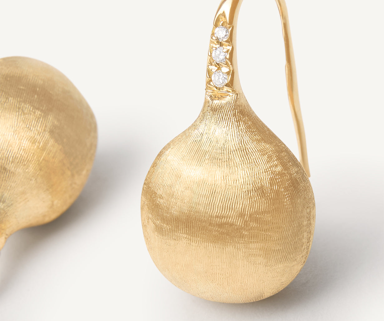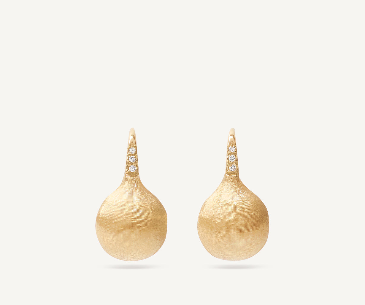 A stylish teardrop design for these 18K yellow gold earrings, finely hand-engraved with an ancient Florentine technique. Each earring has been set with three alluring diamonds near the top. The French wire backings allow for easy and comfortable wear.