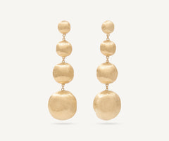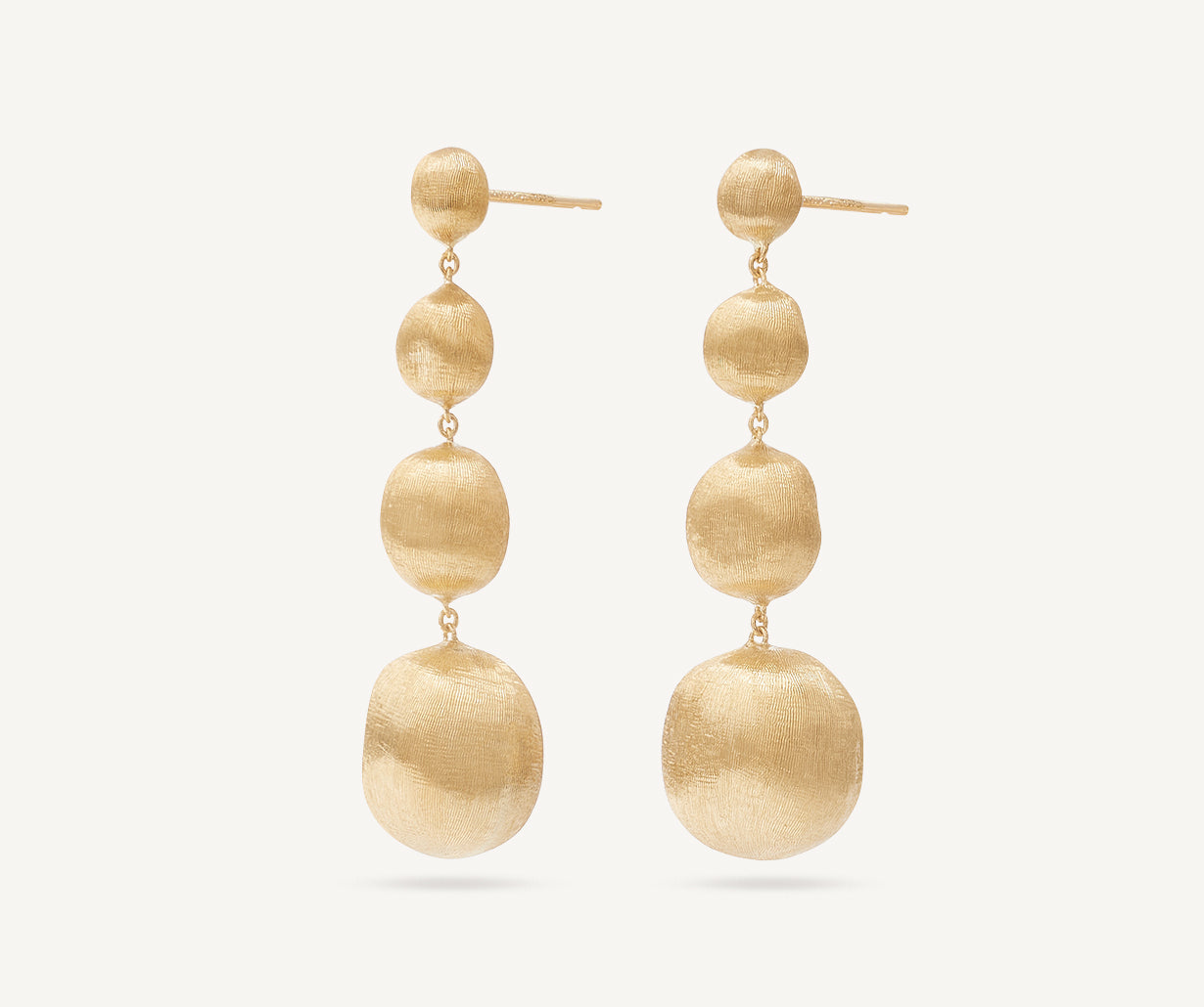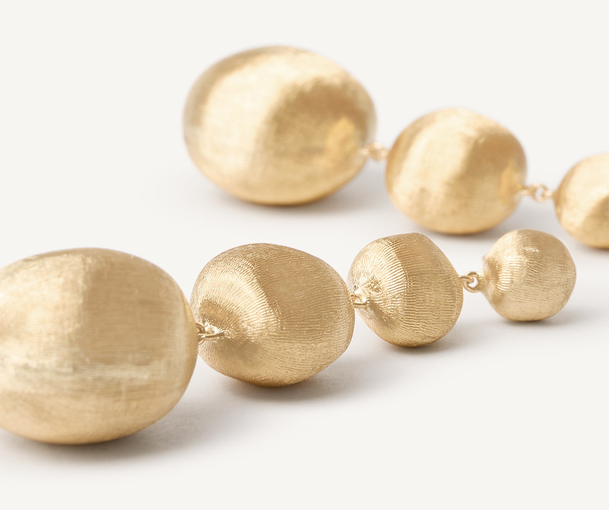 In a perfect interplay of proportions, the degrad�� of spheres lends character and shine to these 18kt yellow gold earrings, finely hand-engraved using an ancient Florentine technique.