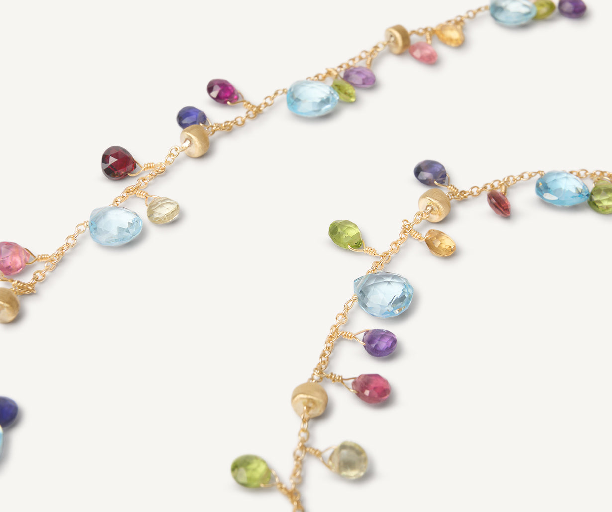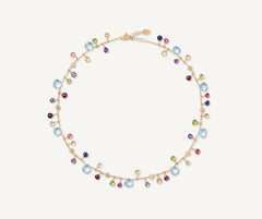 This chain necklace is characterised by highly-prized, heart-cut sky blue topaz alternating with a vibrant blend of multicoloured gemstones and 18kt yellow gold nuggets finely hand-engraved using an ancient Florentine technique.