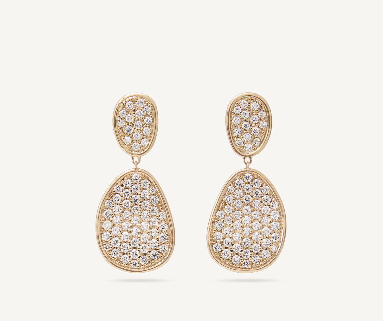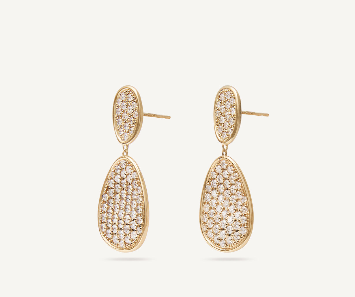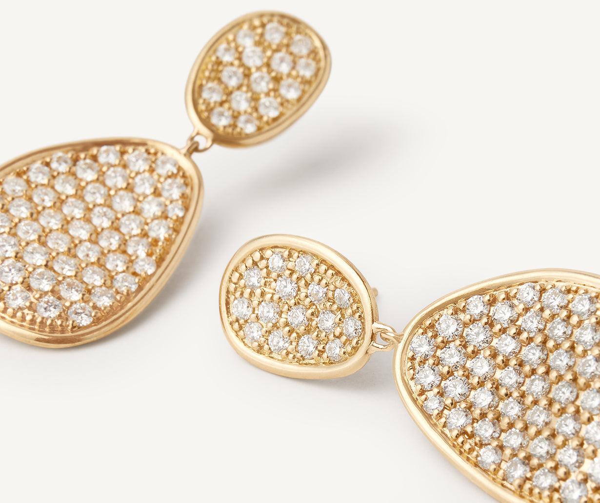 The 18kt yellow gold leaves, hand-engraved using an ancient Florentine technique, are embellished with a pav�� of brilliant-cut diamonds, making these chandelier earrings an iconic piece in the collection for their elegance and refinement.