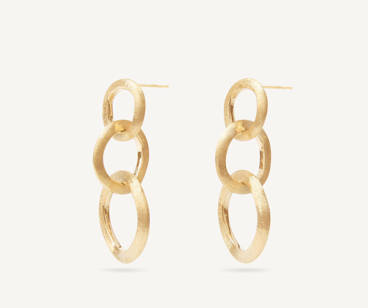 A chain of interlinked irregular circles makes up these chandelier earrings: the perfect balance between a statement jewel and the essential and distinctive design of our collections. In 18kt yellow gold, finely hand-engraved using an ancient Florentine technique.