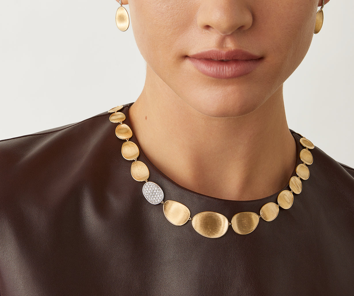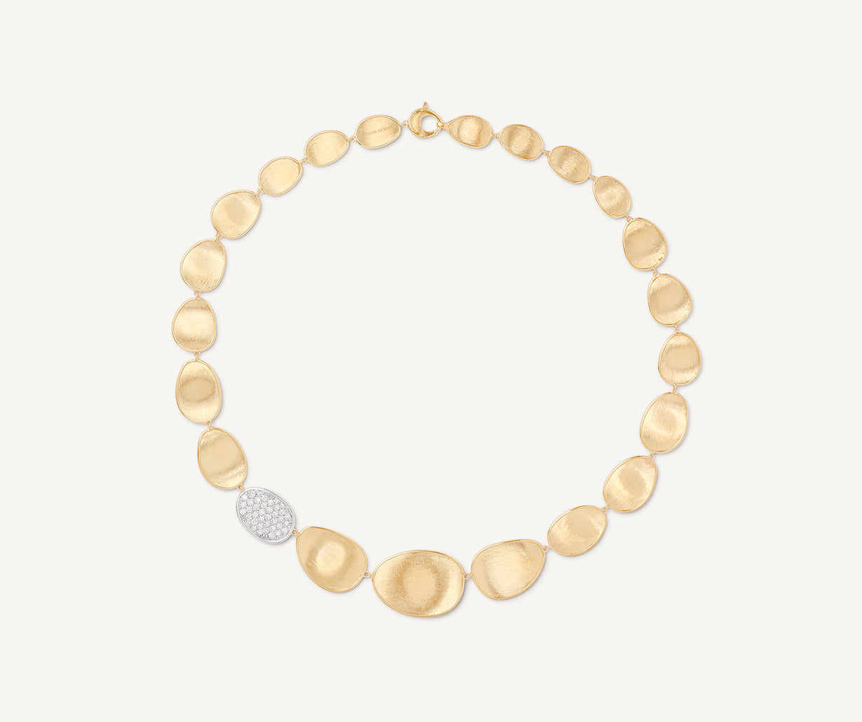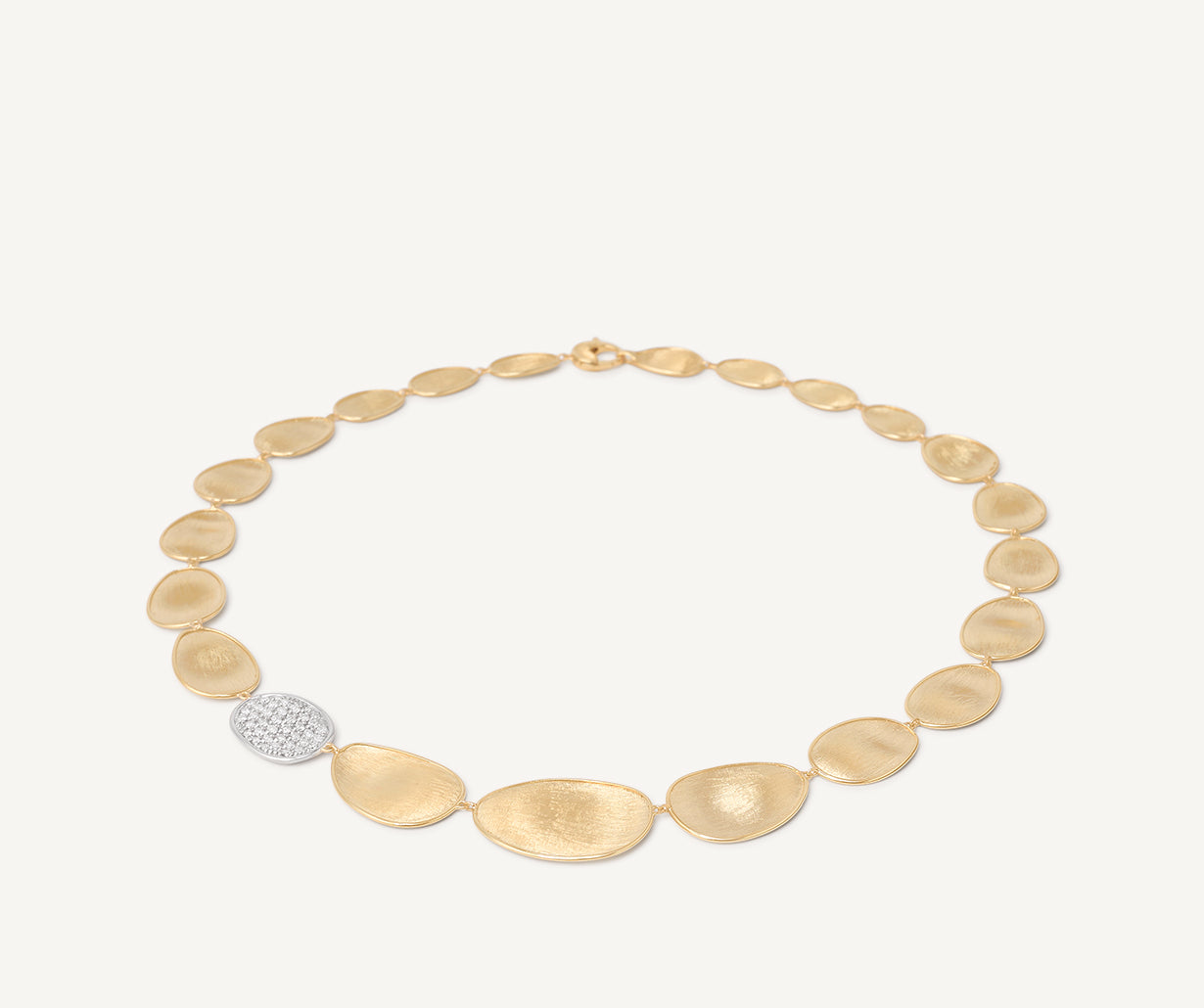 This elegant necklace features a sophisticated fading sequence of 18kt yellow gold leaves, finely hand-engraved using an ancient Florentine technique and embellished by a side leaf enriched with a pav�� of brilliant-cut diamonds. Fascinating and extremely classy.