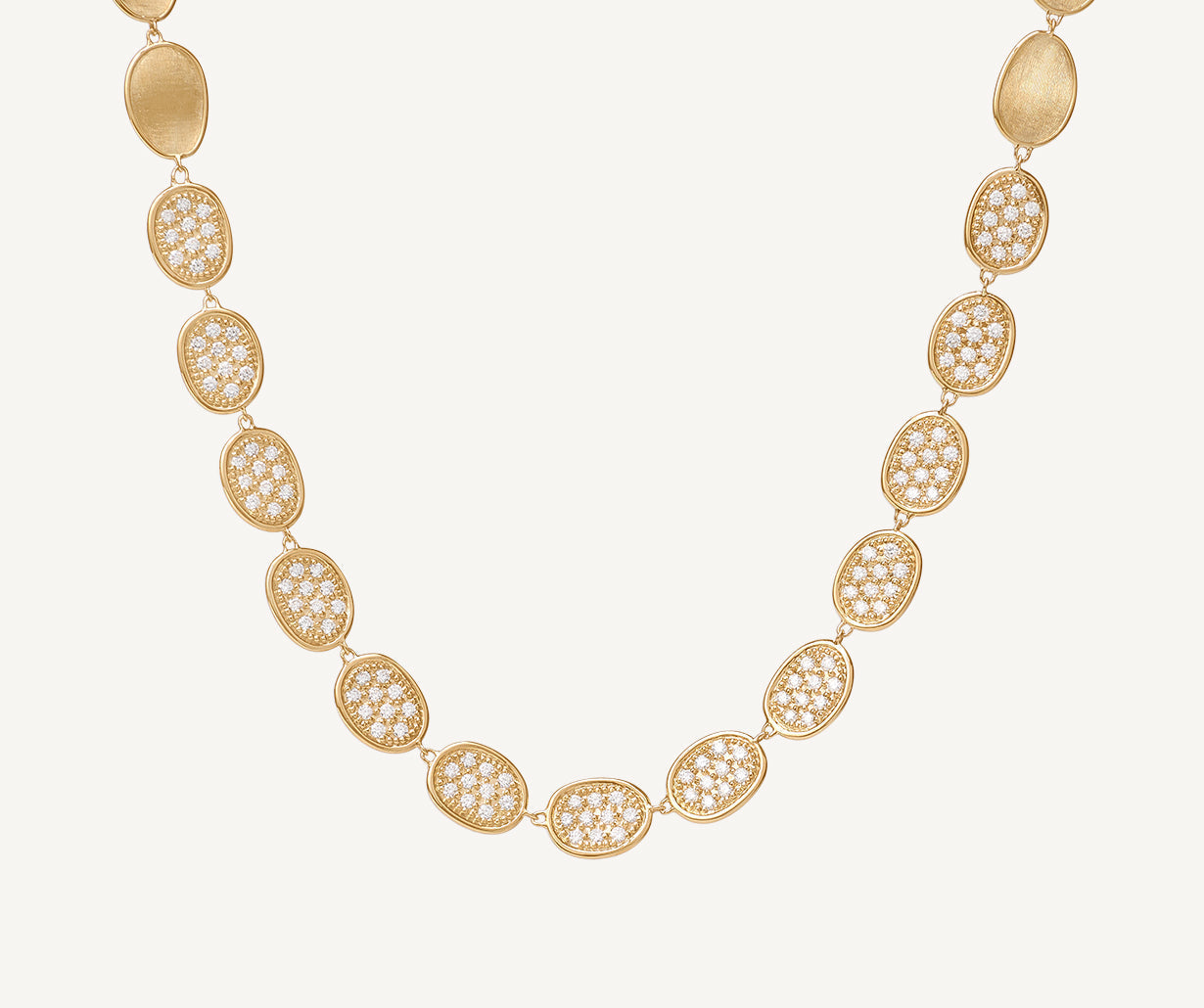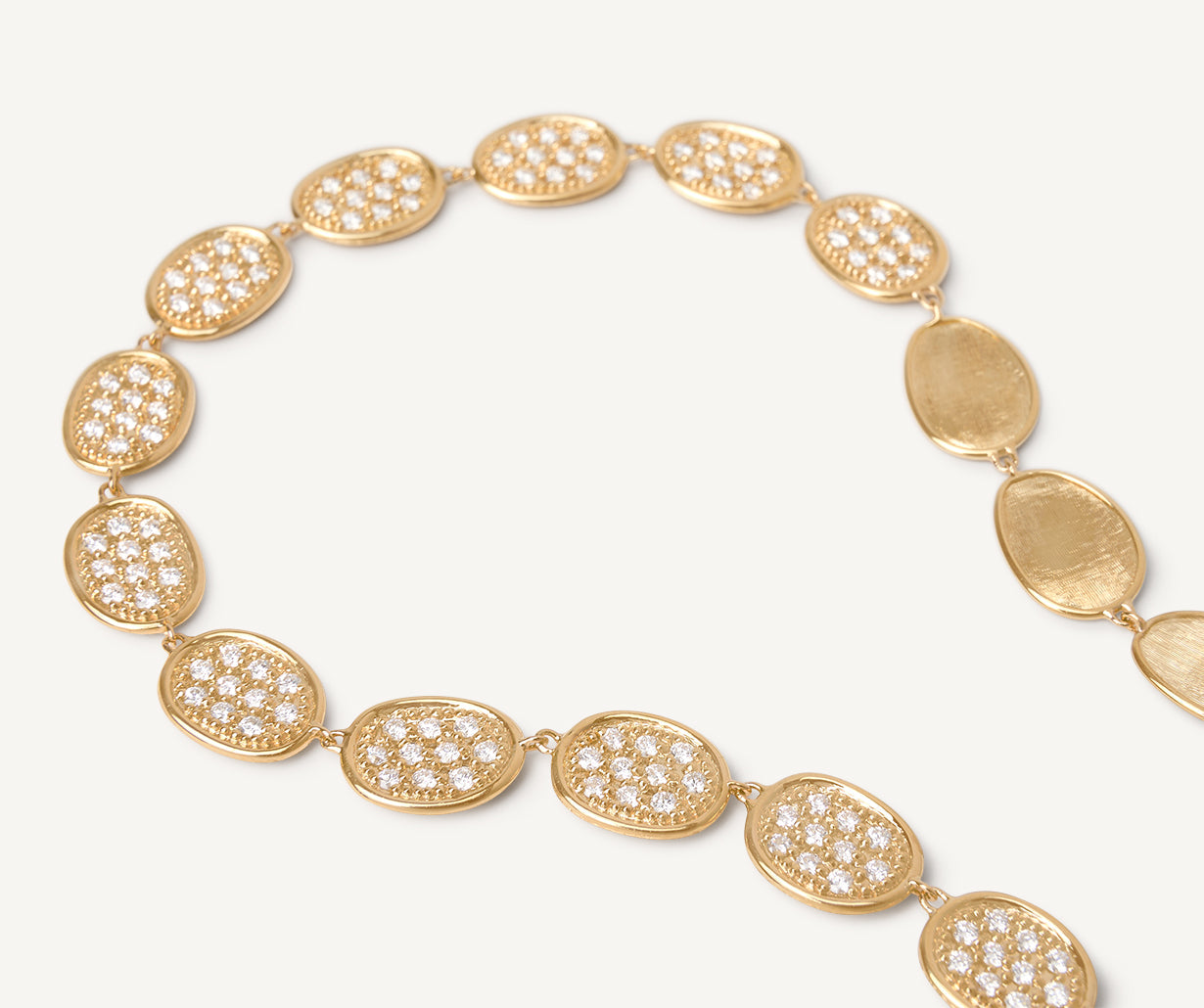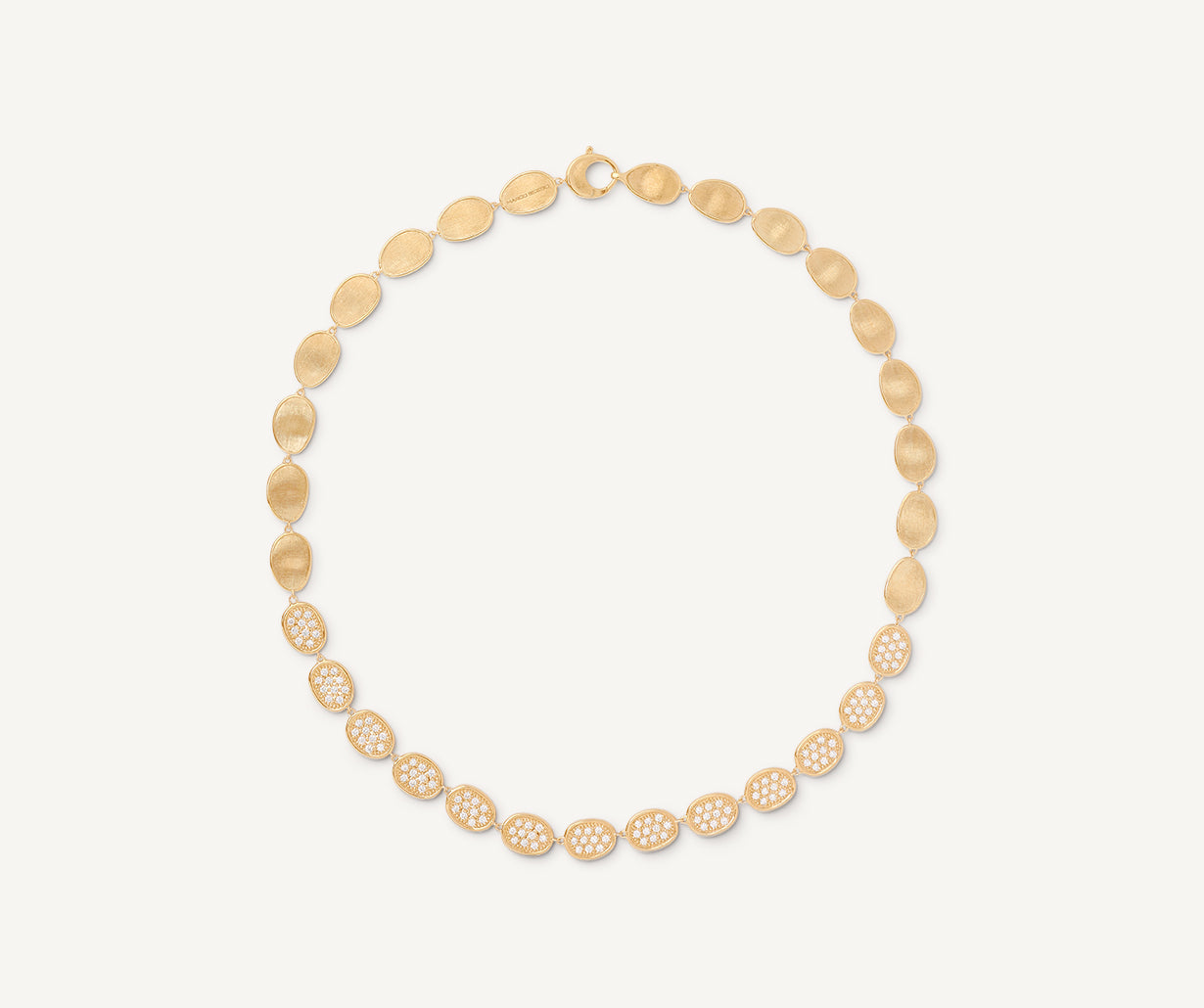 An elegant necklace with a sequence of leaves in 18kt yellow gold, finely hand-engraved using an ancient Florentine technique and enriched with a pav�� of brilliant-cut diamonds.
