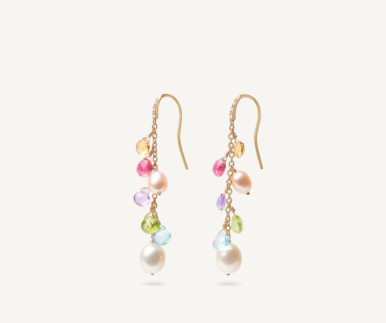 Elegant and sophisticated, these drop earrings feature a cascade of colourful heart-cut gemstones alternating with multicoloured freshwater pearls. They are further embellished with a hook of brilliant-cut diamonds.