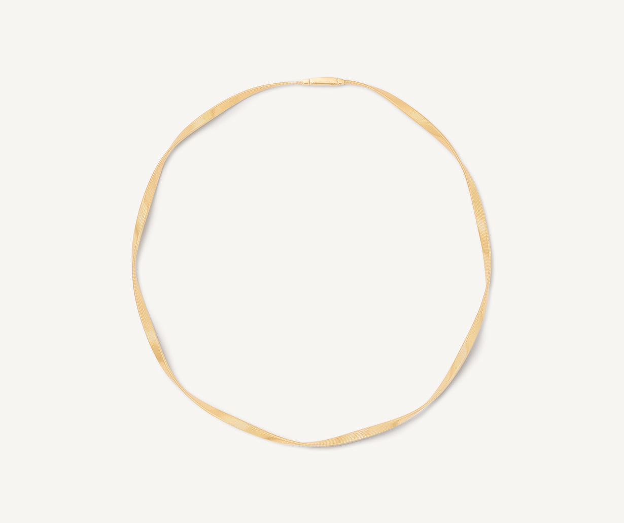 This necklace features a single 18kt yellow gold strand of twisted coil. With its bold styling, this necklace is a timeless classic granting any outfit a touch of radiance.