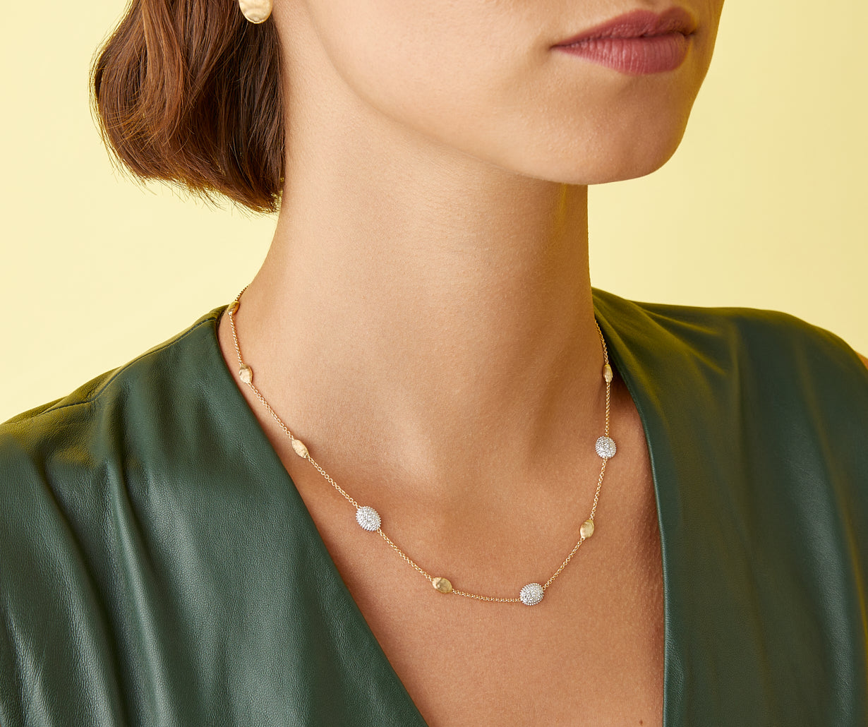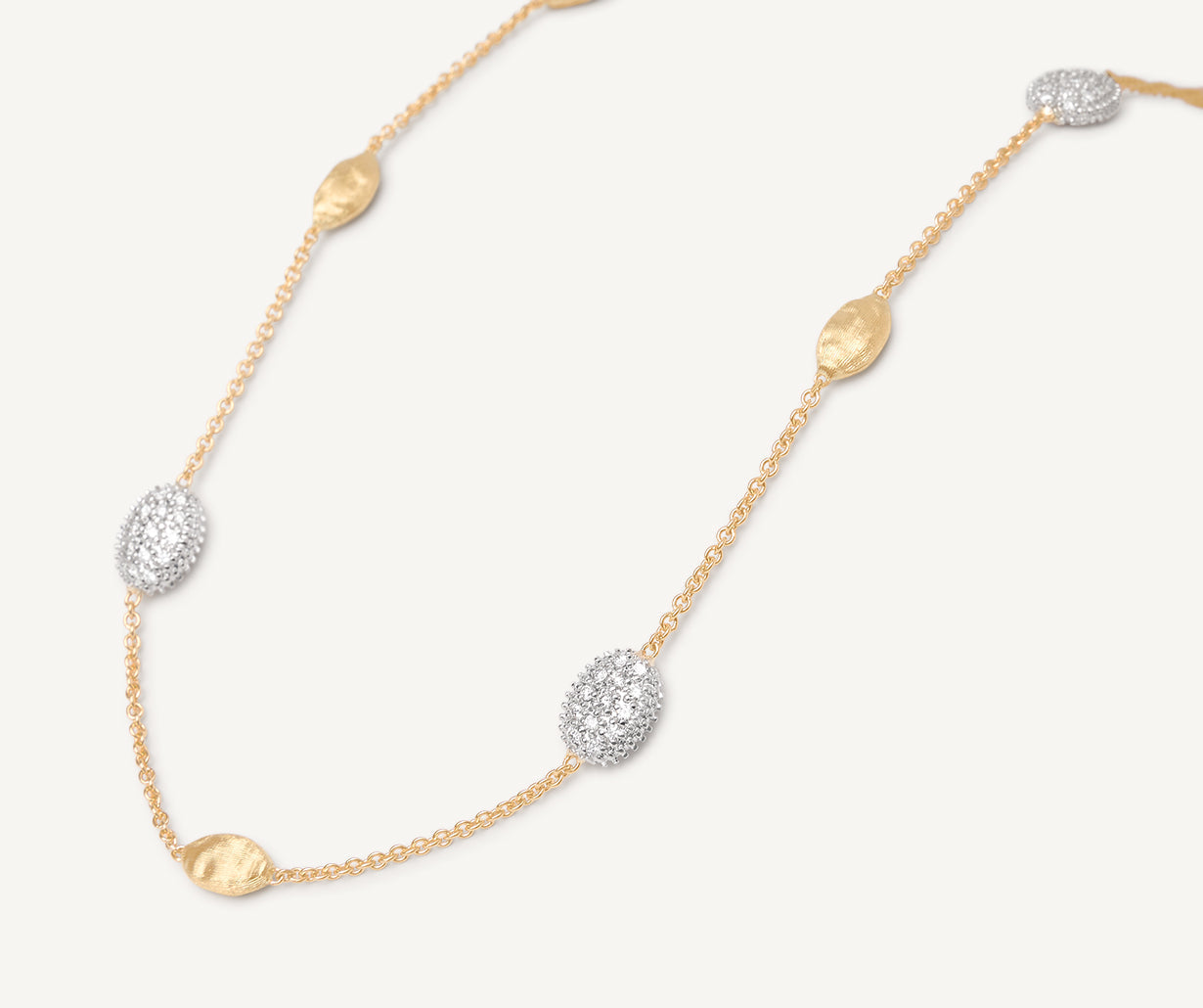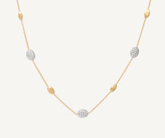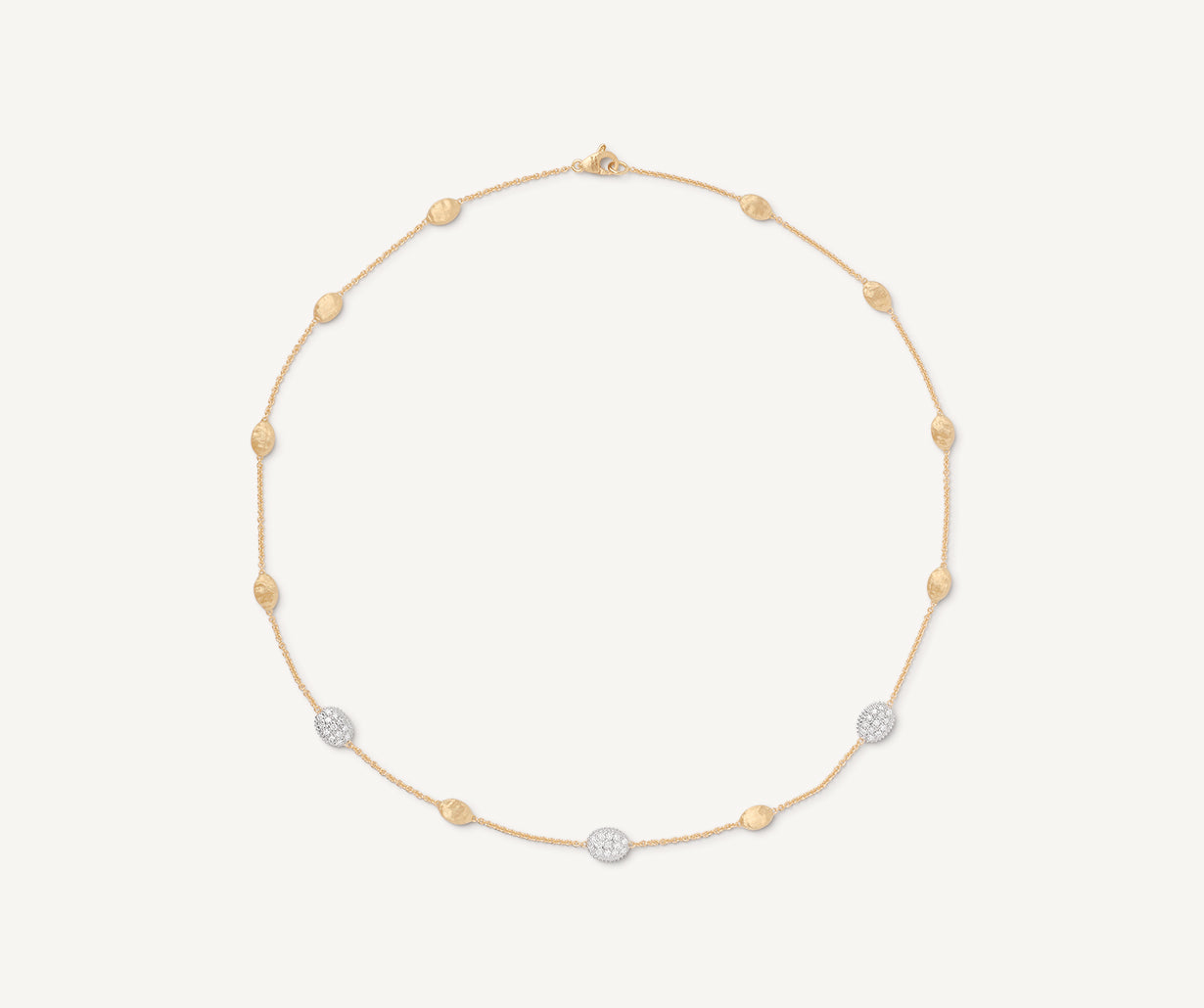 This refined necklace, enriched by small 18kt yellow gold oval elements hand-engraved using an ancient Florentine technique, features three brilliant-cut diamond pav��s that grant the jewel exceptional radiance and elegance. It offers a unique touch of lustre and elegance. Adjustable closure.