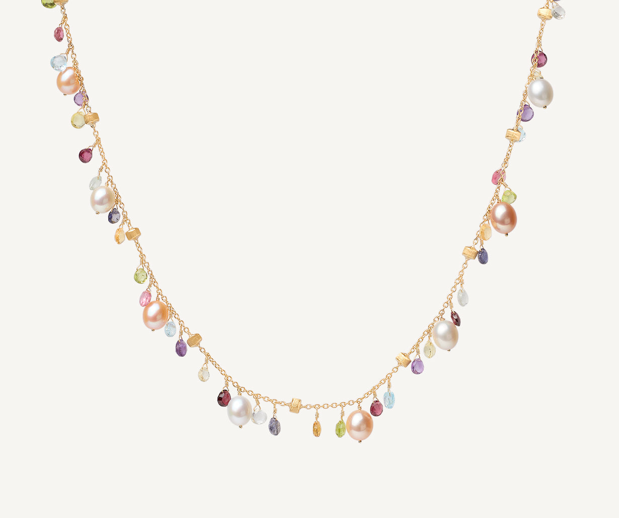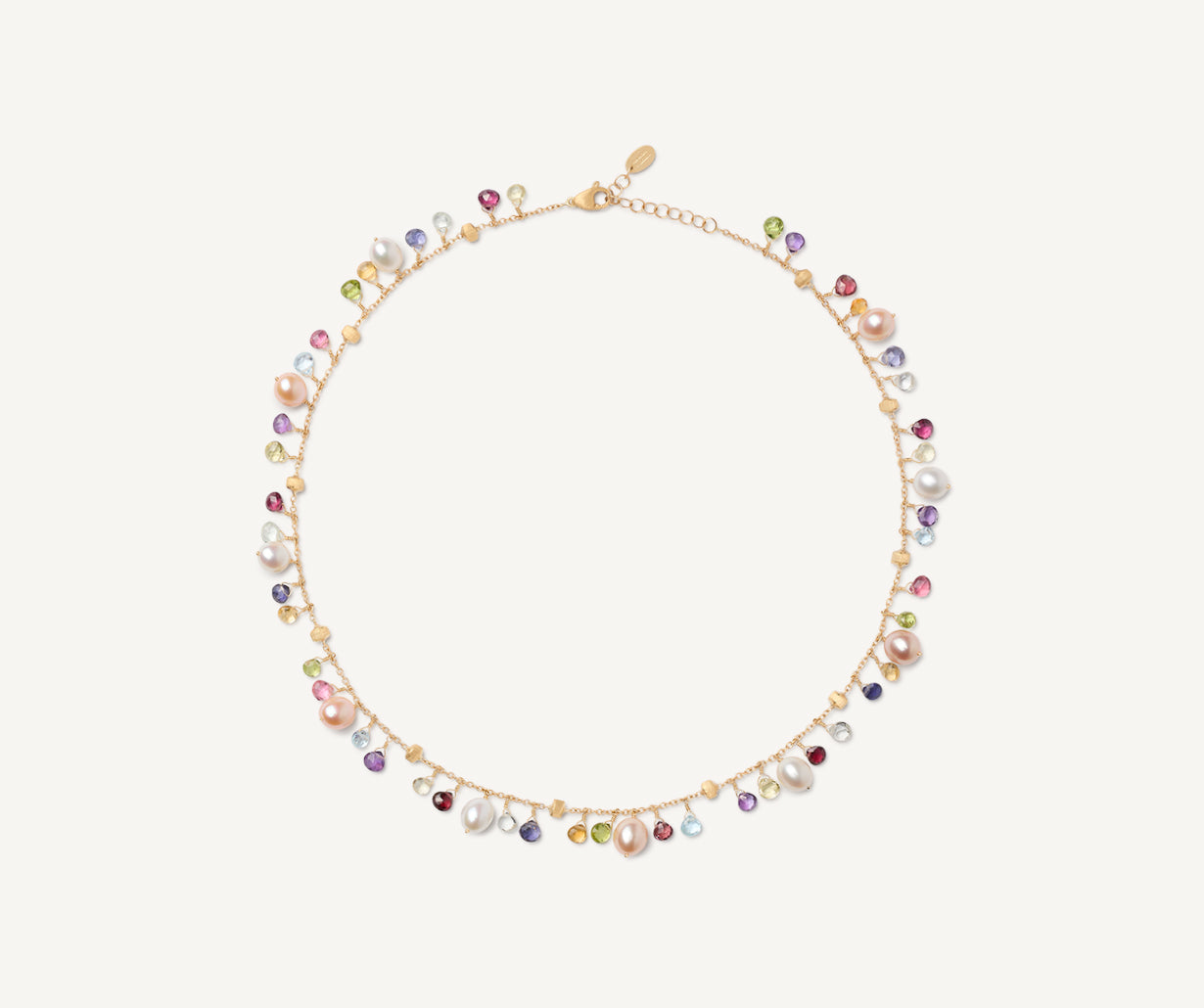 Characterised by infinite shades of colour, this necklace is a combination of heart-cut natural gemstones, delicate multicoloured freshwater pearls and tiny golden beads, hand-engraved with an ancient Florentine technique.