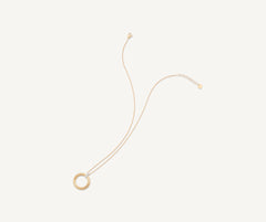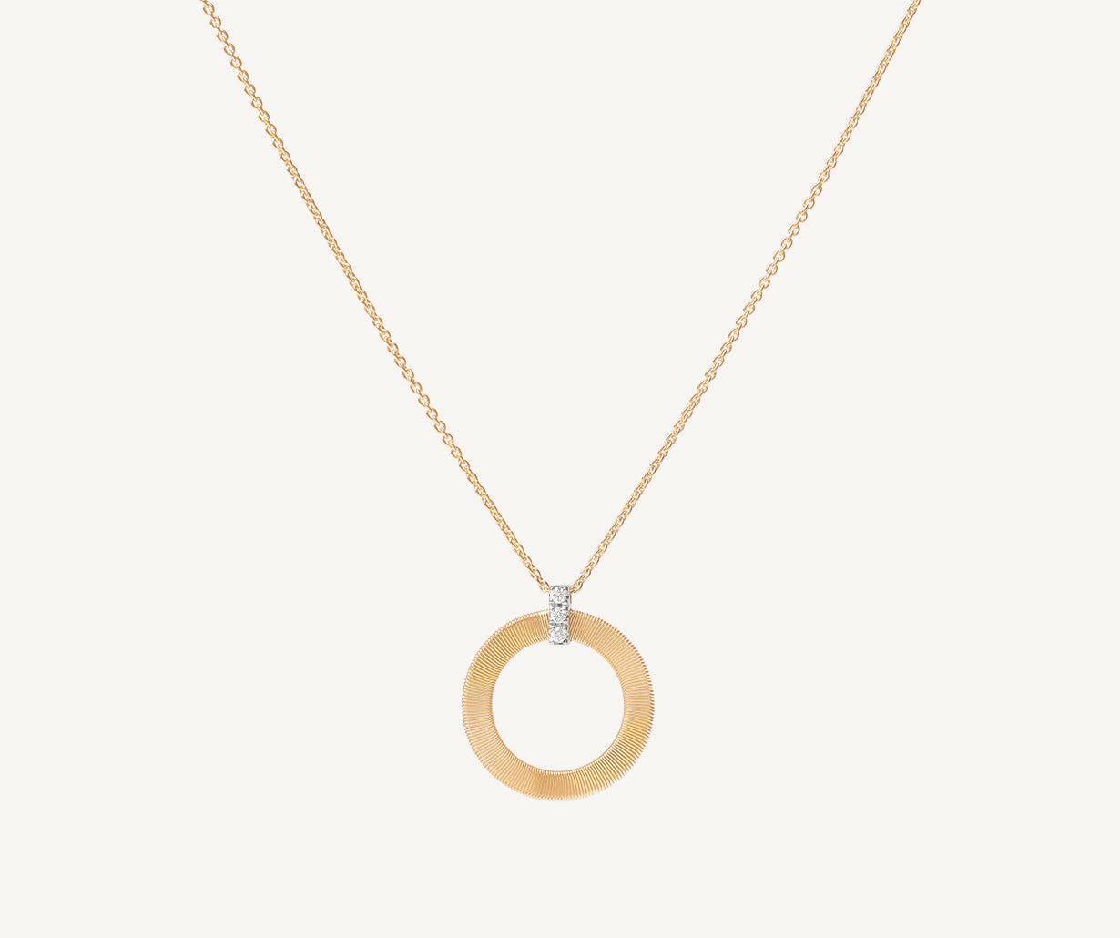 This pendant in 18kt yellow gold comes with an adjustable chain and is characterised by a circular flat-coil element. Sophisticated and linear in design, it is embellished by a pendant bail studded with brilliant-cut diamonds. Versatile and stylish, it is the perfect choice for everyday wear.