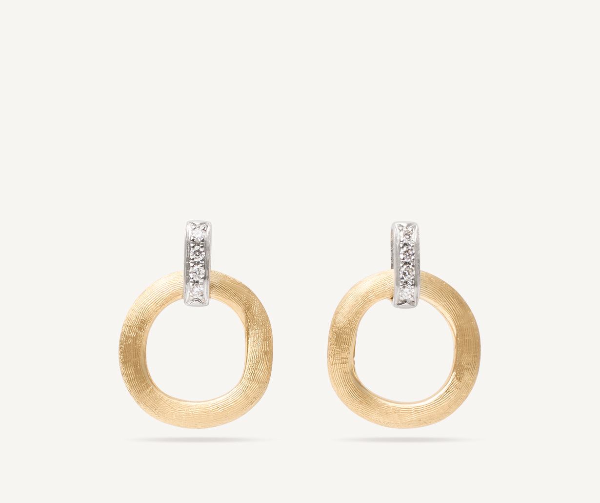 These stud earrings are characterised by sophisticated and captivating irregular circles in 18kt yellow gold, finely hand-engraved with an ancient Florentine technique. A brilliant-cut diamond pav�� adds a sublime sparkle.
