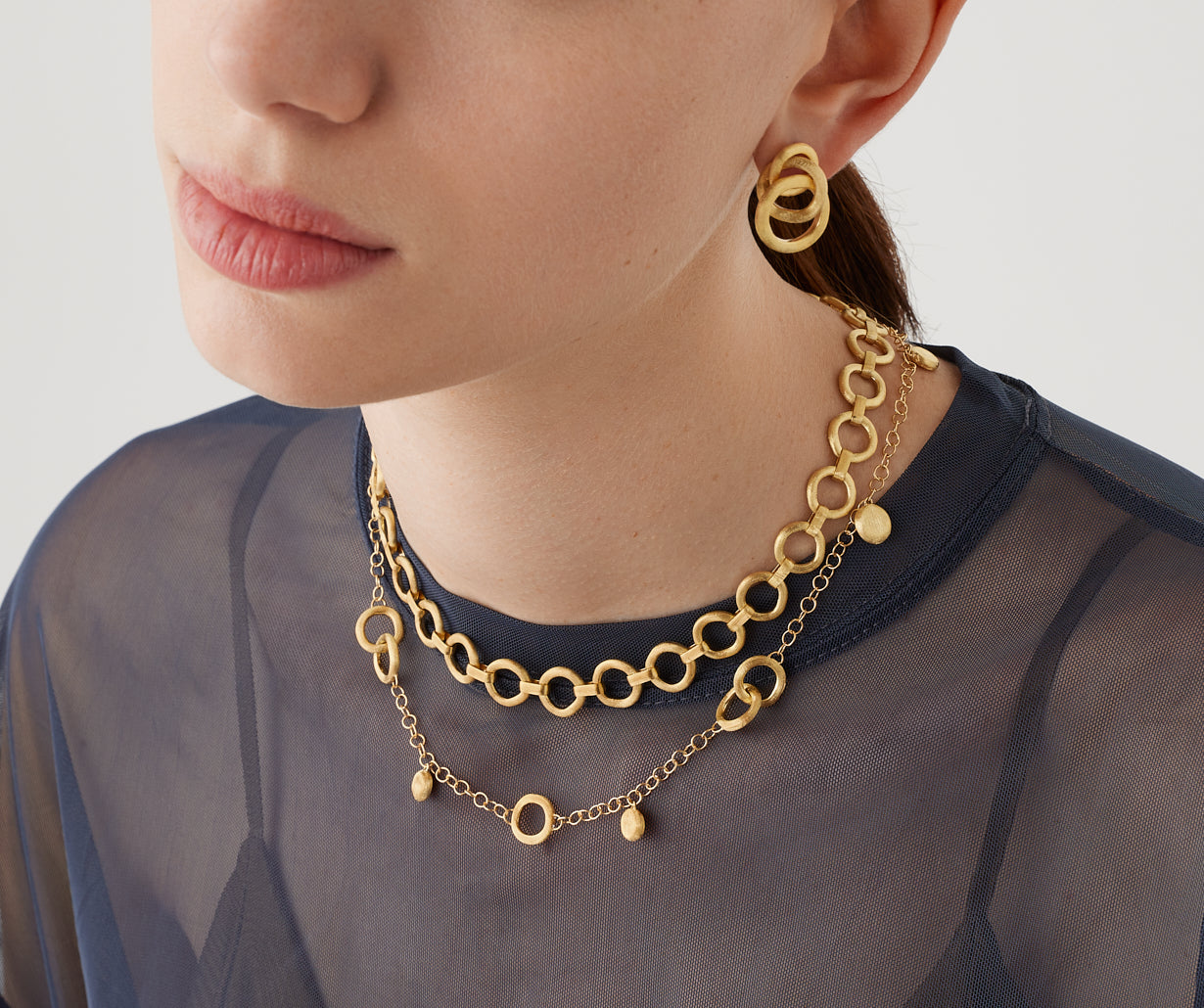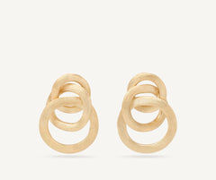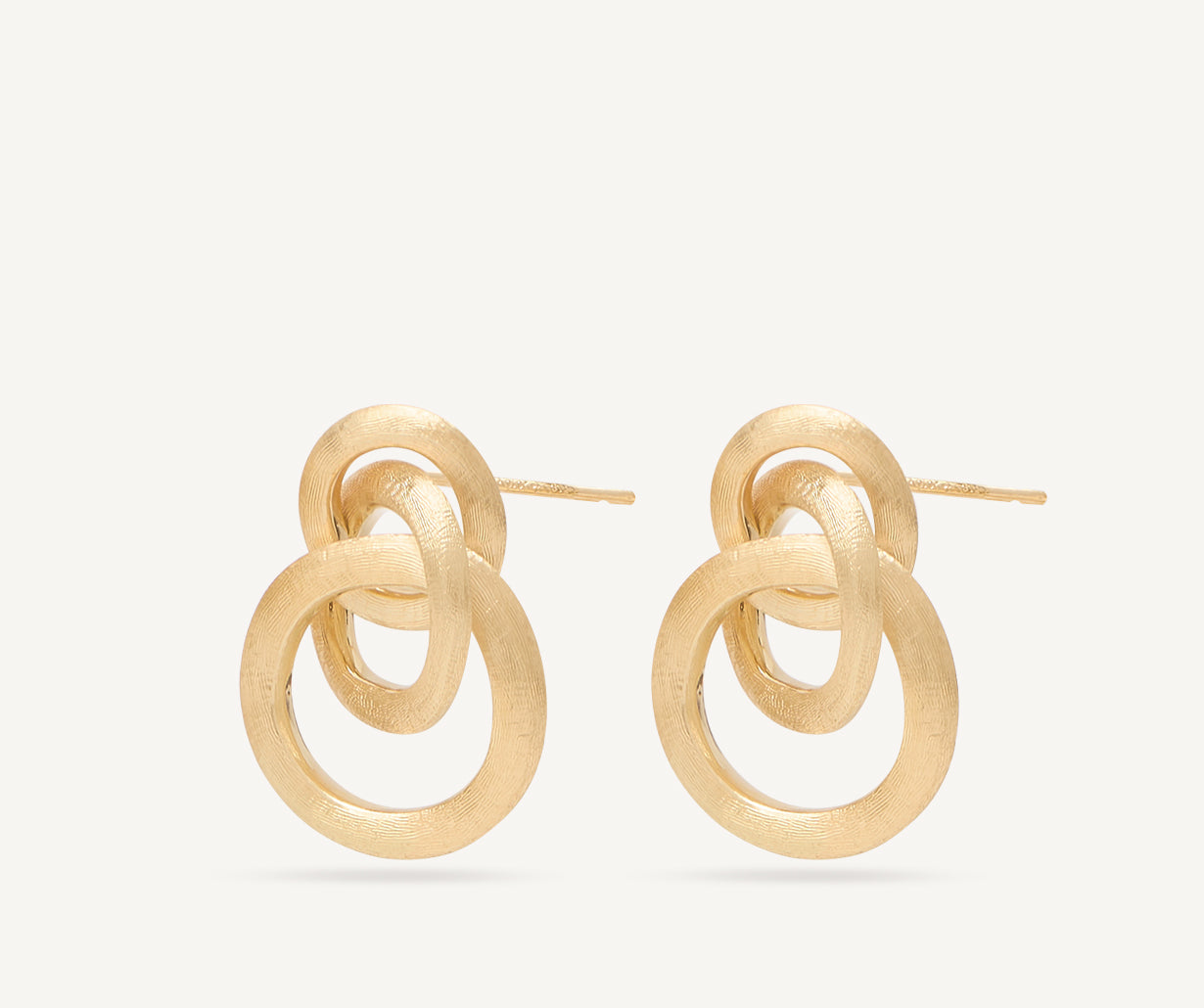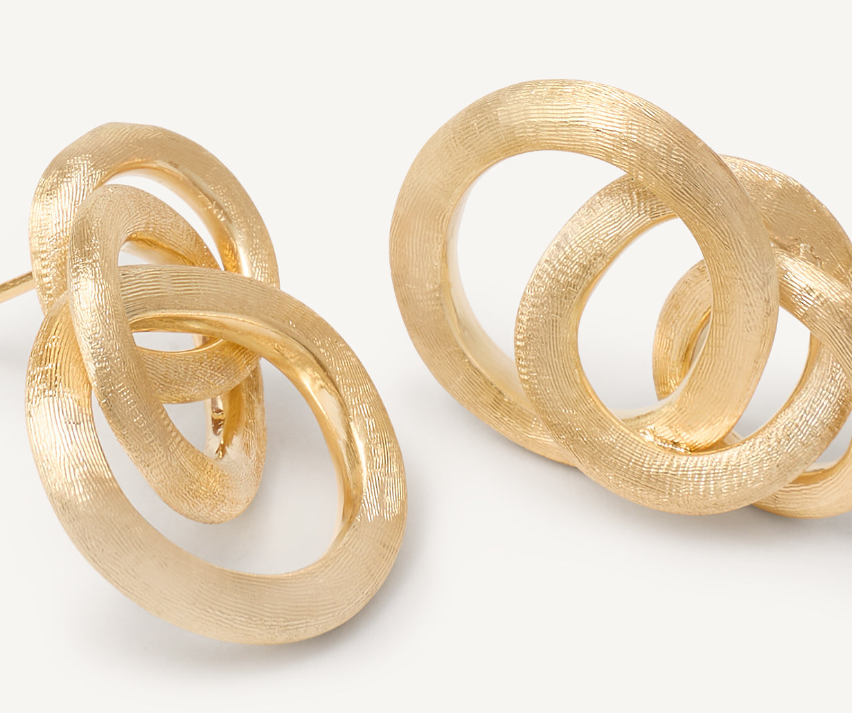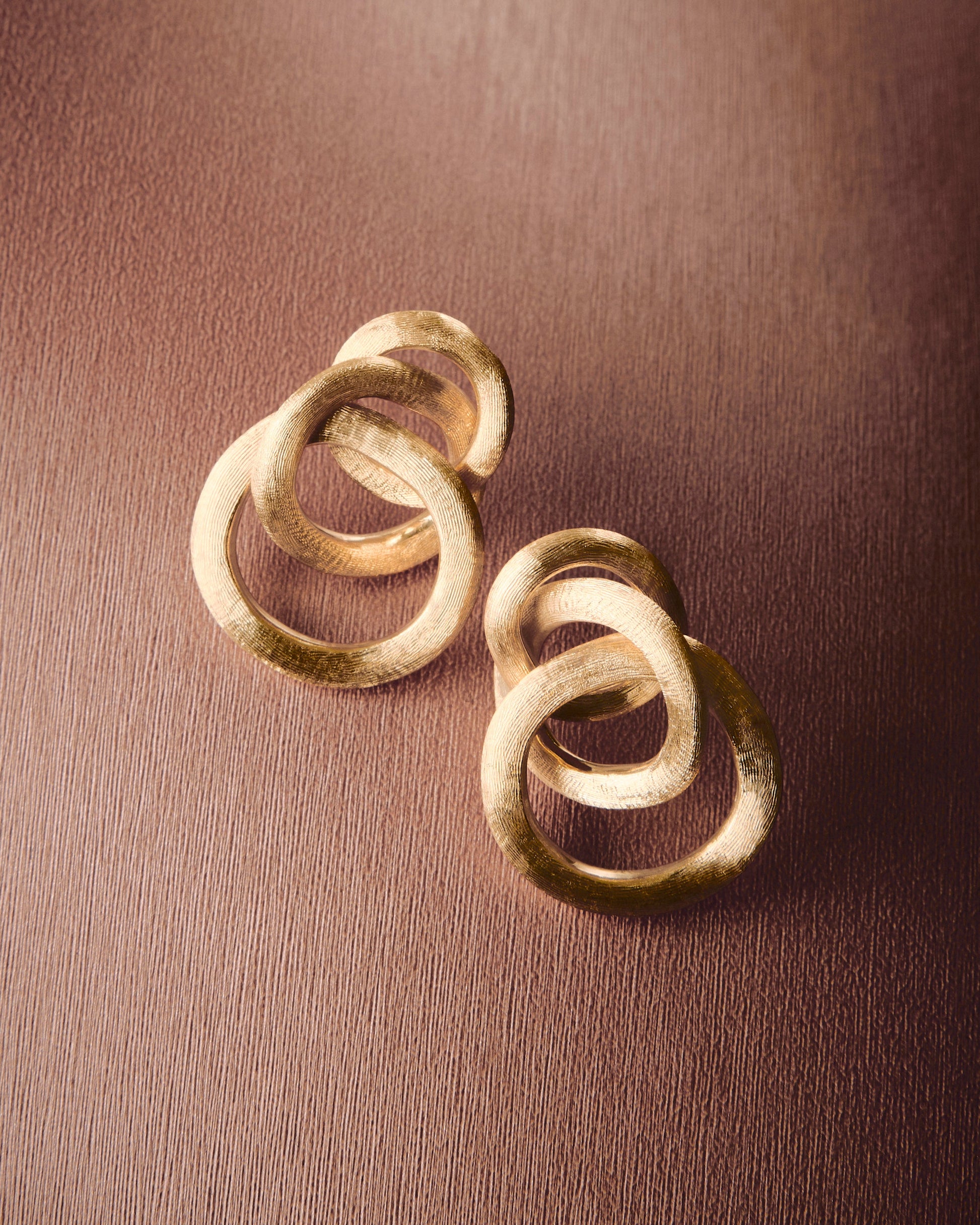 Three links strung together in an elegant irregular weave. These earrings, in 18kt yellow gold, are finely hand-engraved using an ancient Florentine technique.