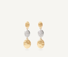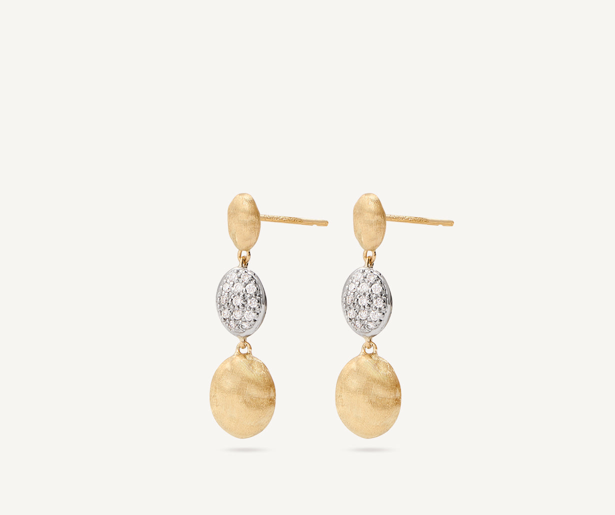 These sophisticated earrings stand out for their elegant degrad�� sequence of 18kt yellow gold oval elements with an irregular surface, finely hand-engraved using the ancient Florentine technique. The earrings are further embellished by a central brilliant-cut diamond pav��.