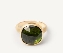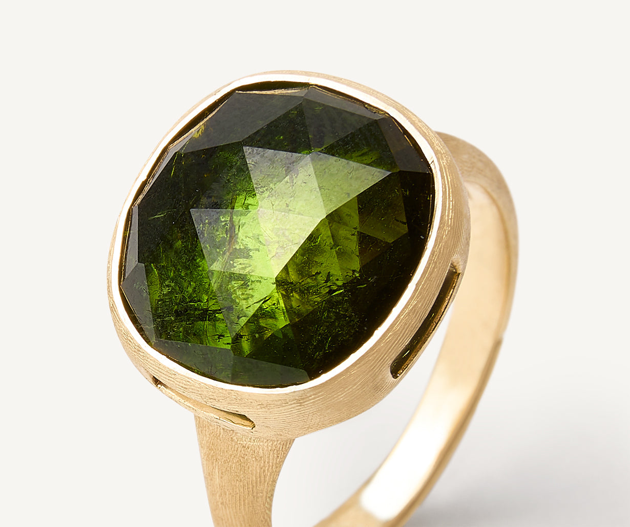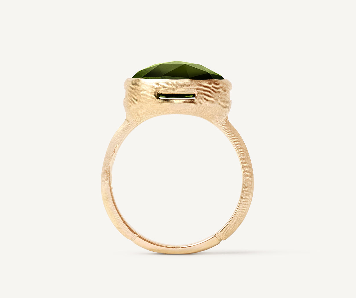 This elegant 18kt yellow gold ring is finely hand-engraved using an ancient Florentine technique. The green tourmaline, with its exclusive cut, is enhanced by a lateral slit, which allows the light to enter and facilitates the rings maintenance.