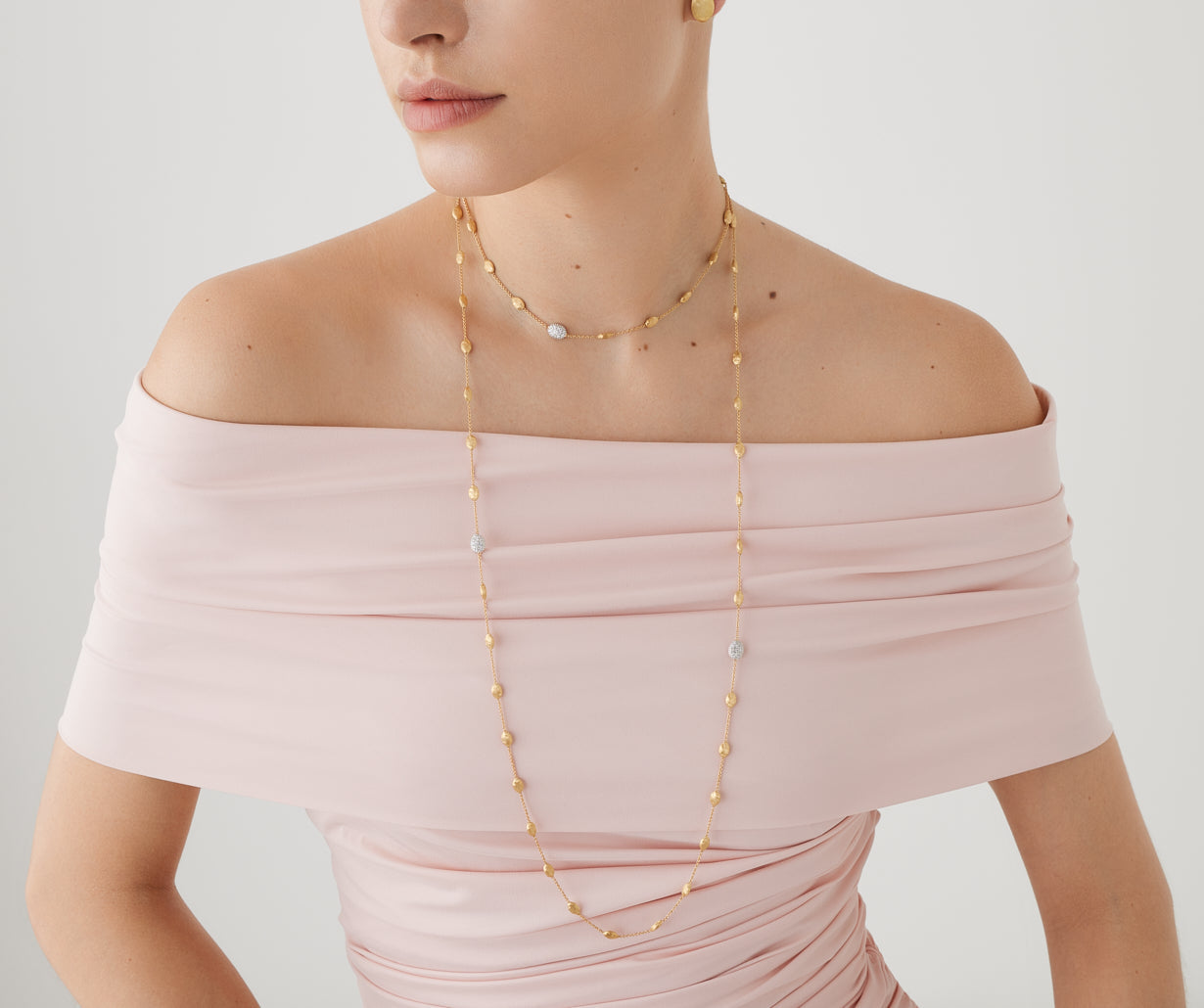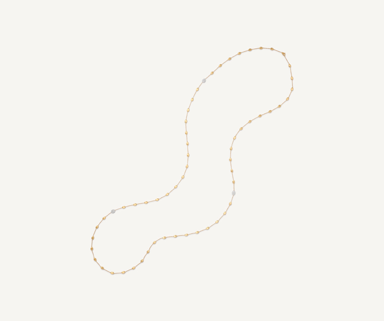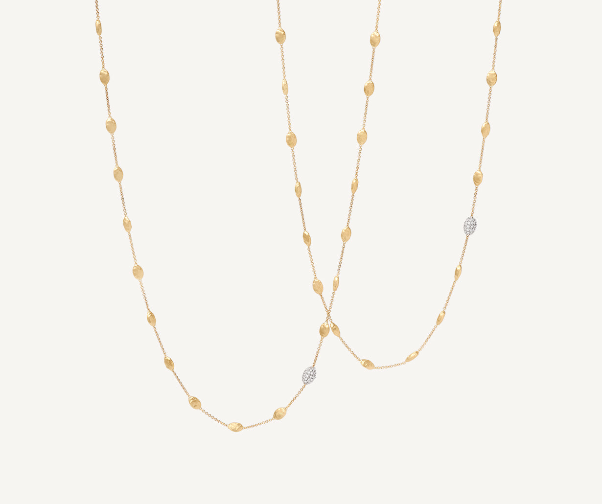 This very long necklace features a sequence of tiny 18kt yellow gold ovals with an irregular surface, finely hand-engraved using an ancient Florentine technique, and is embellished by brilliant-cut diamond pav��s. Classic and sophisticated, when worn doubled it lends a bold look to any outfit.