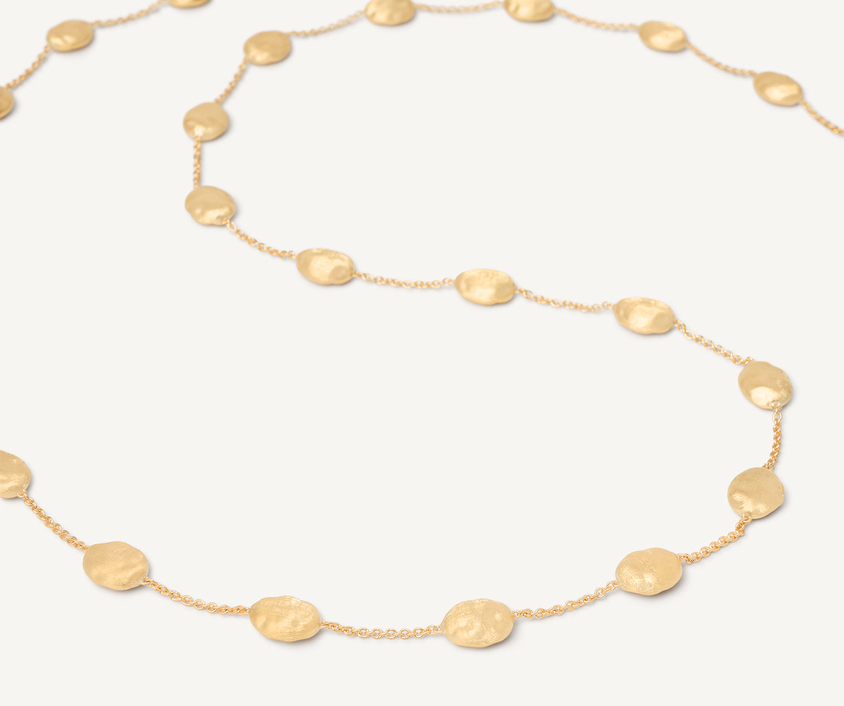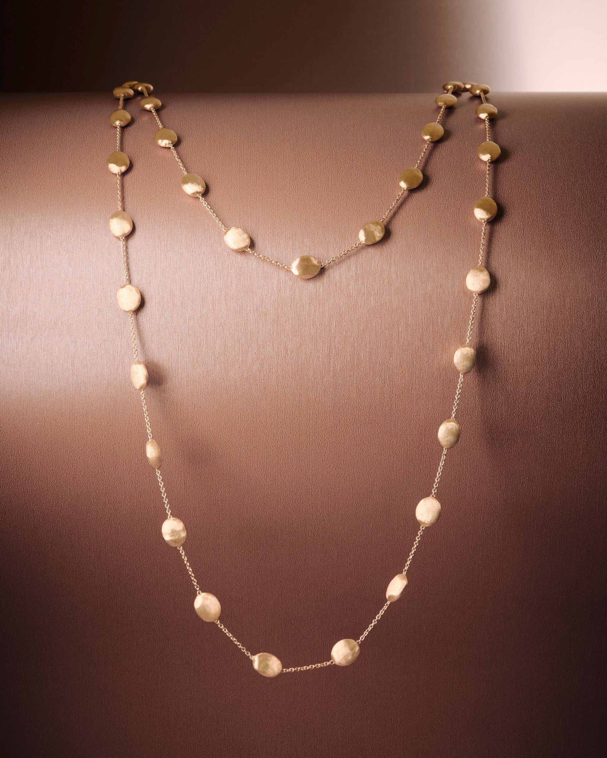 This long chain features small 18kt yellow gold ovals with an irregular surface, hand-engraved using an ancient Florentine technique. Stylishly timeless, it is the perfect choice for every outfit and every occasion.