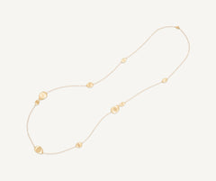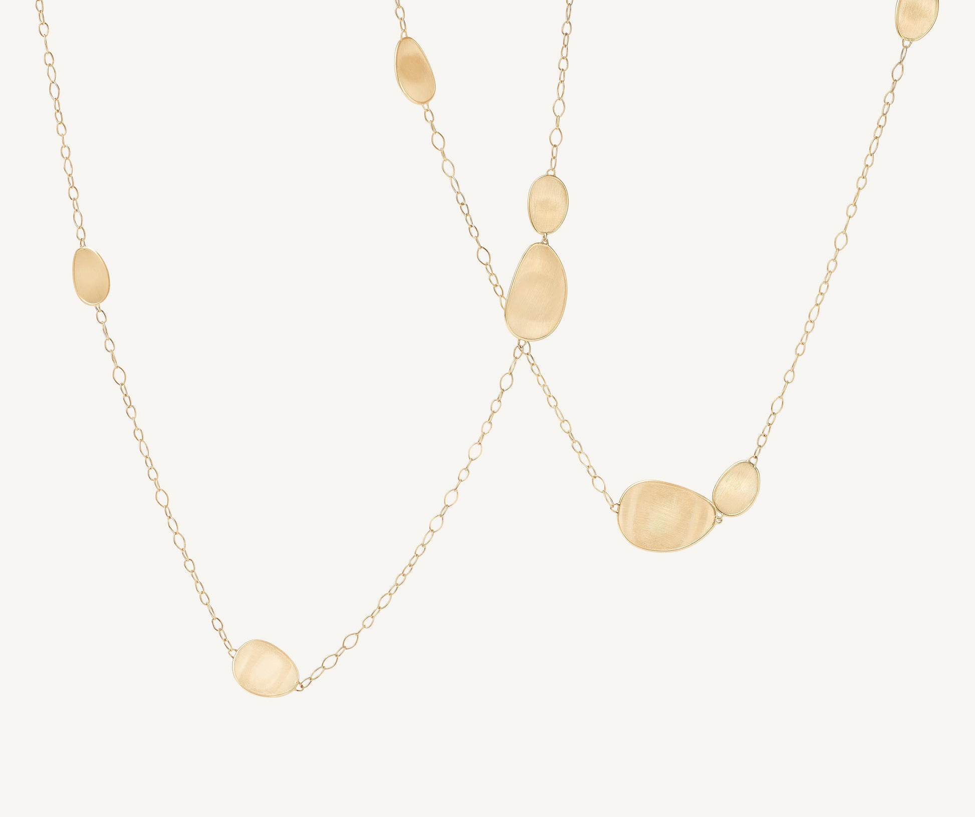 Inspired by the charm of nature, this long necklace is made up of a succession of light leaves in 18kt yellow gold, finely hand-engraved with the ancient millerighe engraving technique and interspersed with a thin chain. Perfect worn both long and doubled.