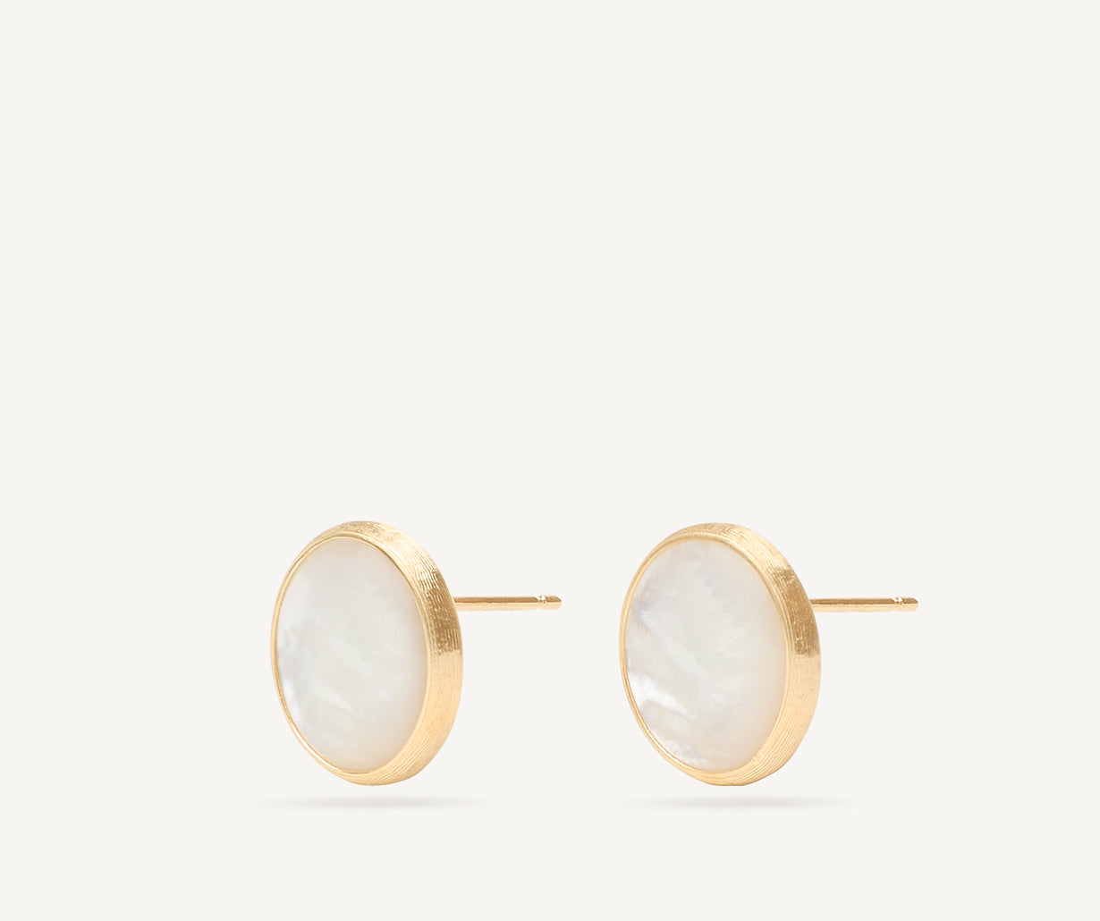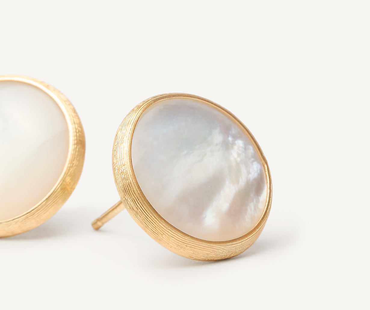 An oversized version of the iconic stud earrings from the Jaipur Collection, these earrings are characterised by a pair of highly-prized mother-of-pearls, framed by an 18kt yellow gold bezel setting hand-engraved using an ancient Florentine technique.