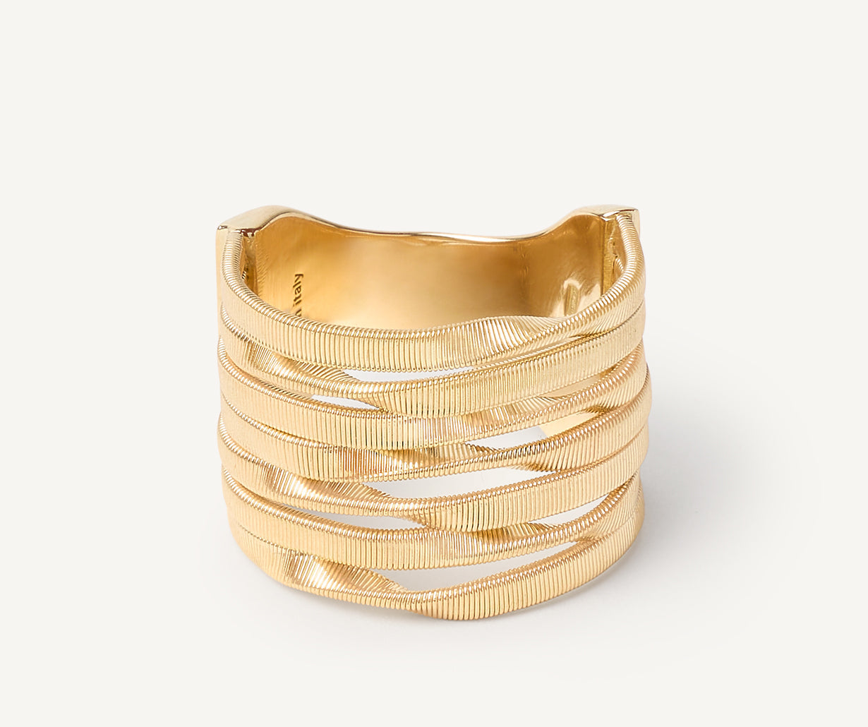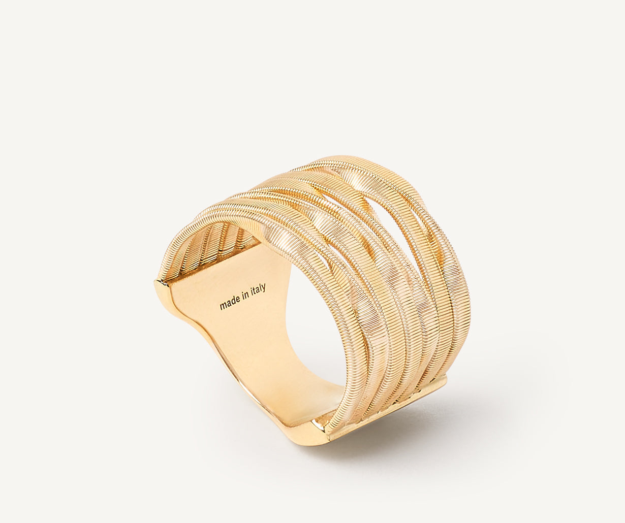 A true prt-a-porter icon, this stylish 18kt yellow gold ring, boasting striking volumes and unique wearability, is crafted from seven spiral threads carefully created with the exclusive coil technique.