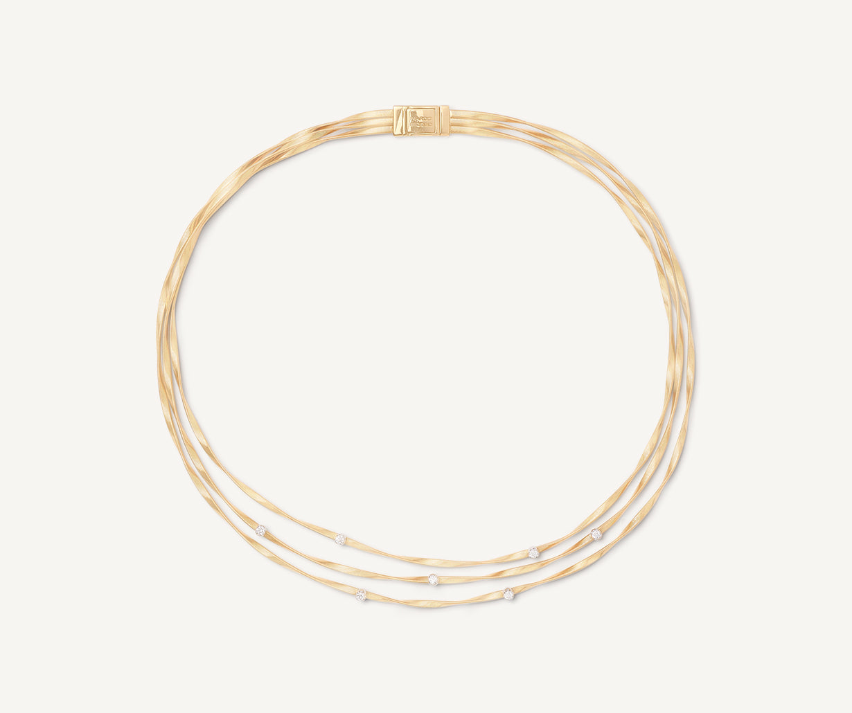 Seven brilliant-cut diamonds add a touch of dazzling sparkle to this elegant three-strand, twisted coil necklace in 18kt yellow gold. A jewelry piece that is sure to turn heads.