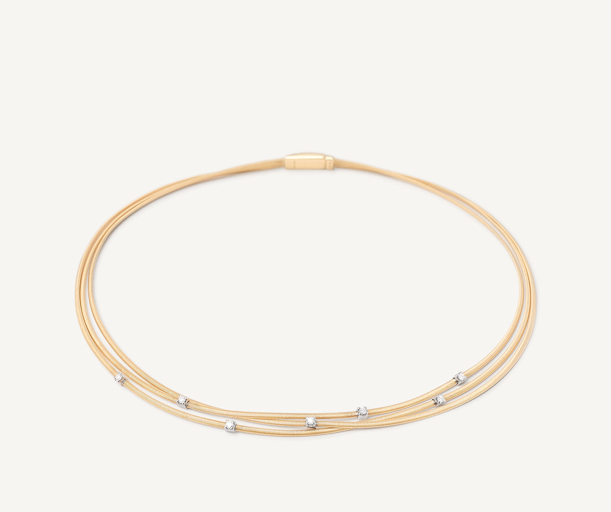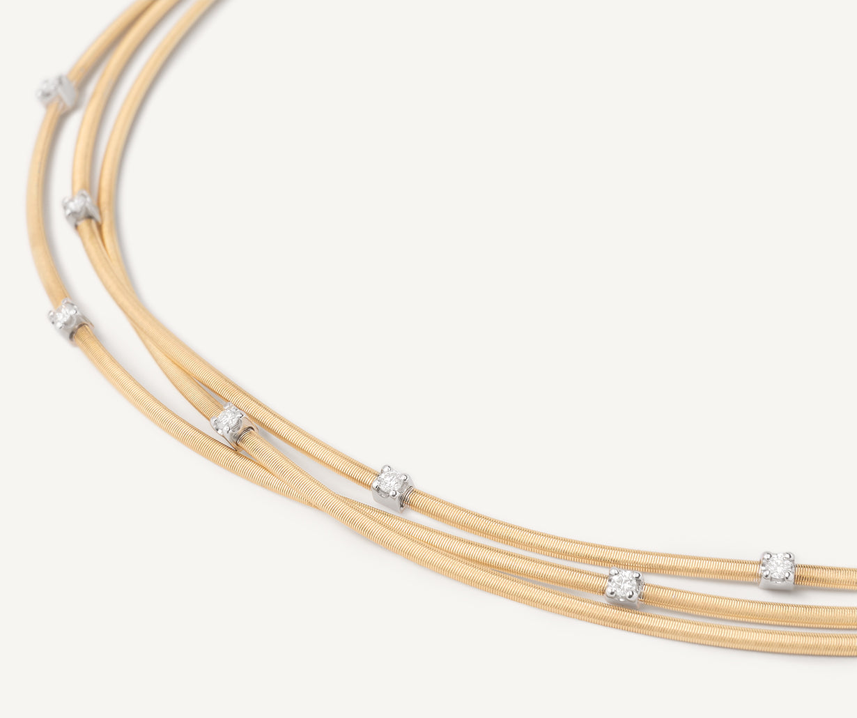 Three spiraling, flat strands, created by the exclusive craftsmanship of the coil, intertwined with the extraordinary brilliance of this 18kt yellow gold necklace and featuring seven brilliant-cut diamonds for an even more precious touch of sparkle. A timeless classic.