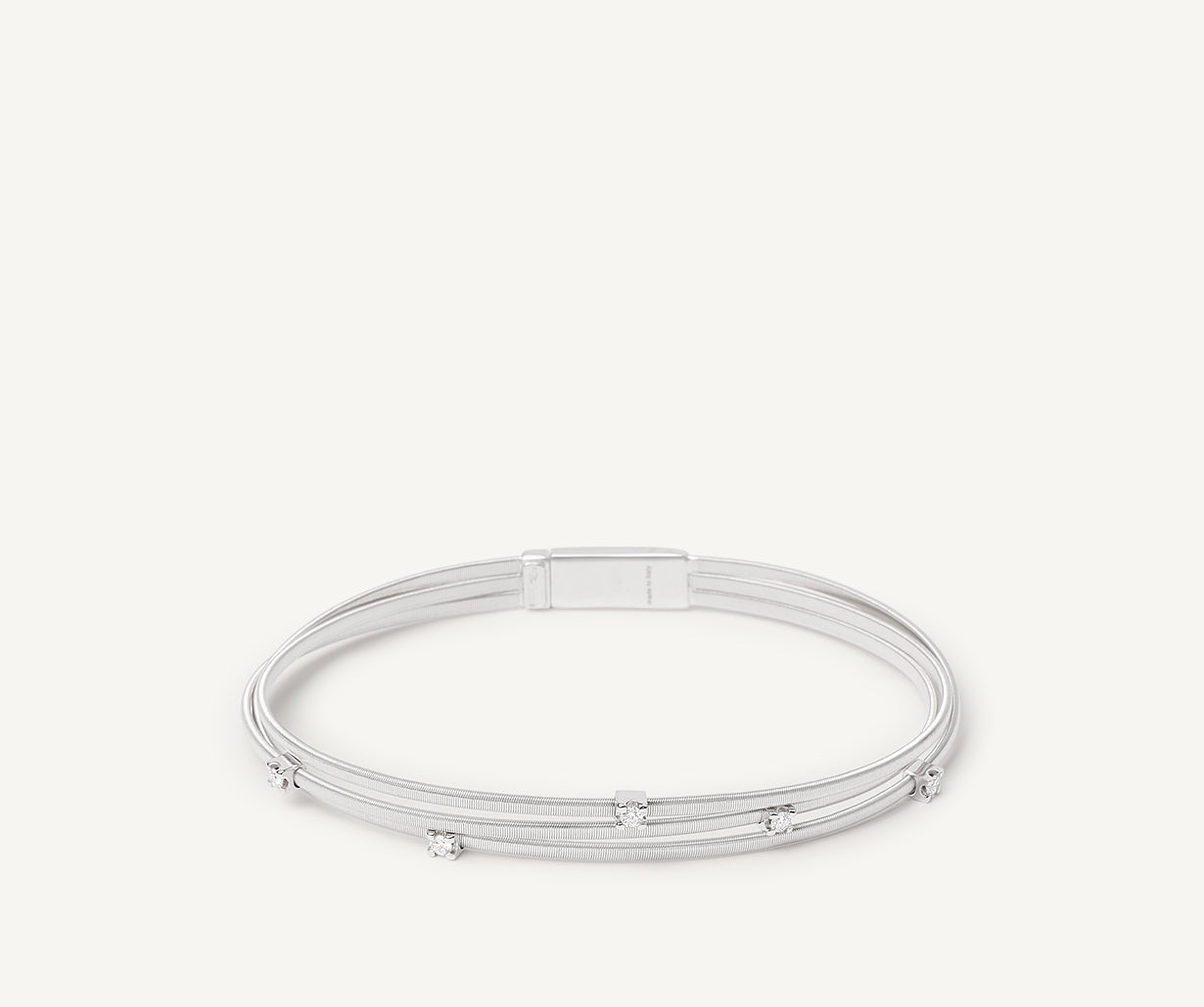 Three strands of flat spiral threads, carefully created with the exclusive coil technique, meet in a play of extraordinary brilliance in this 18kt white gold bracelet featuring five brilliant-cut diamonds.