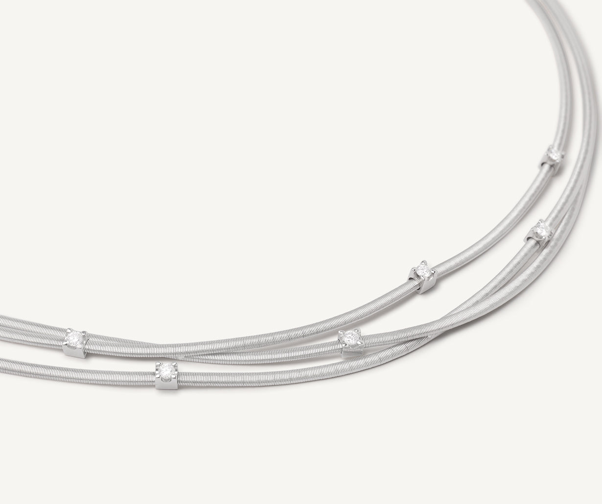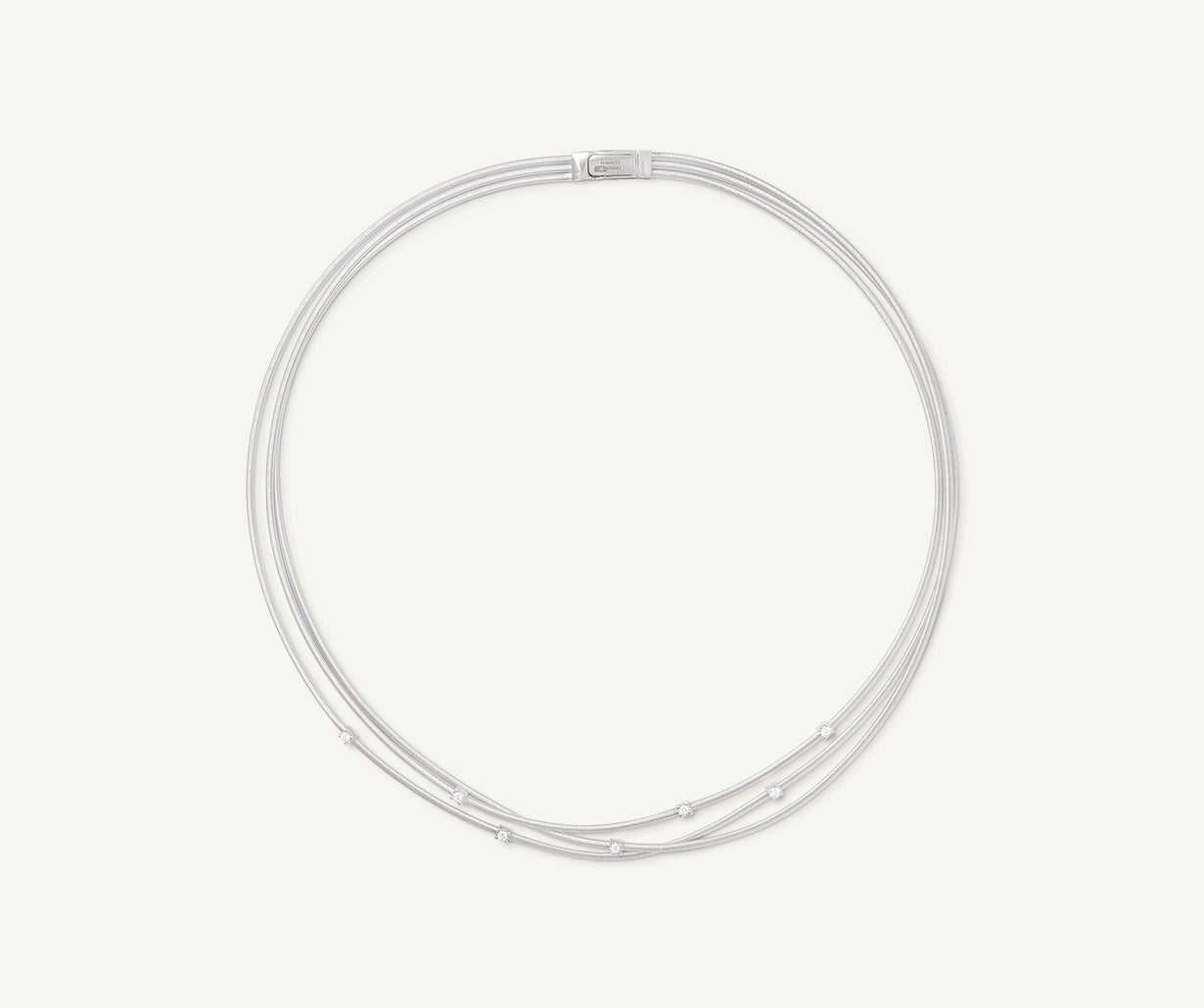 Three spiraling, flat strands, created by the exclusive craftsmanship of the coil, intertwined with the extraordinary brilliance of this 18kt white gold necklace and featuring seven brilliant-cut diamonds for an even more precious touch of sparkle. A timeless classic.