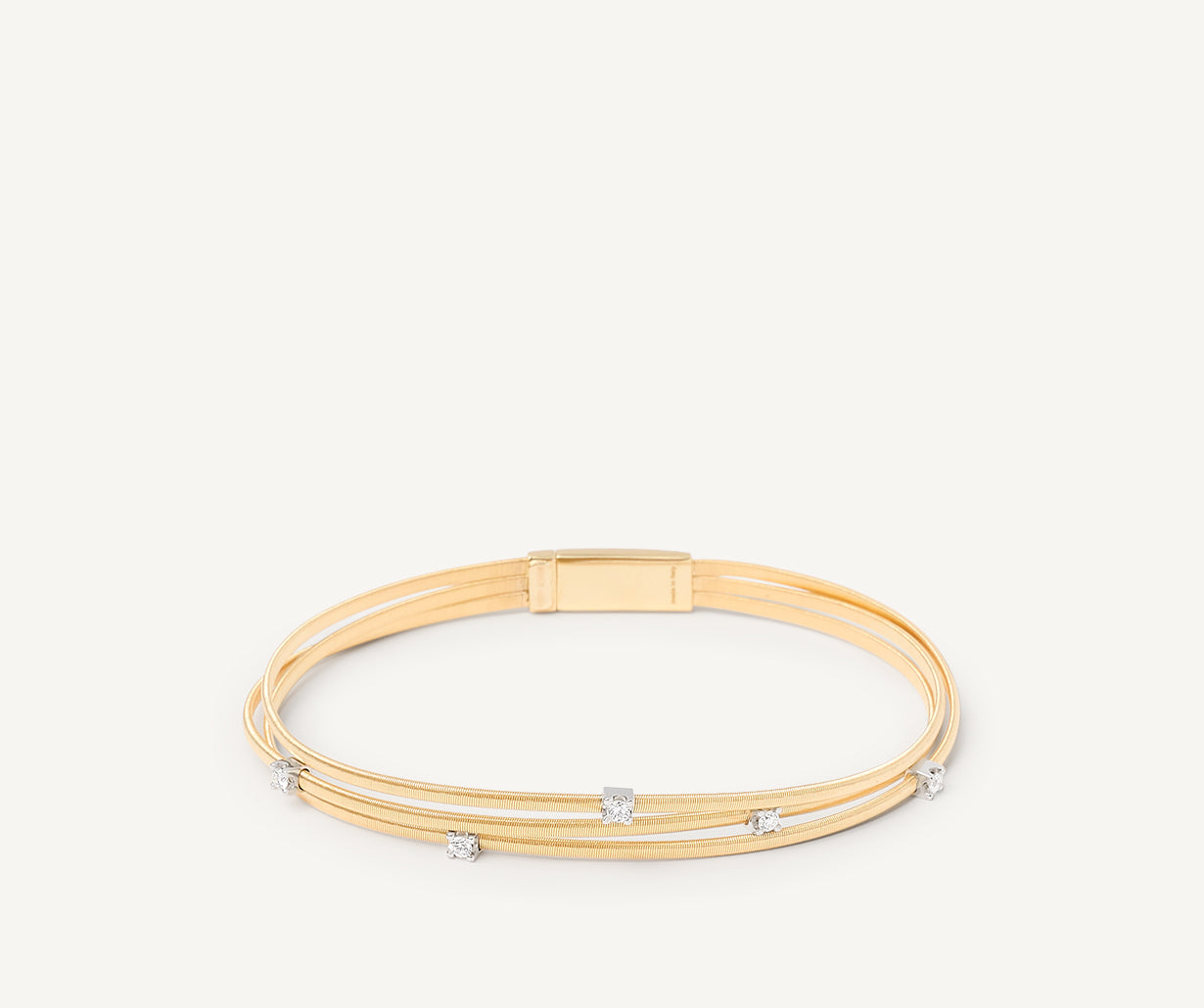Three strands of flat spiral threads, carefully created with the exclusive coil technique, meet in a play of extraordinary brilliance in this 18kt yellow gold bracelet featuring five brilliant-cut diamonds.