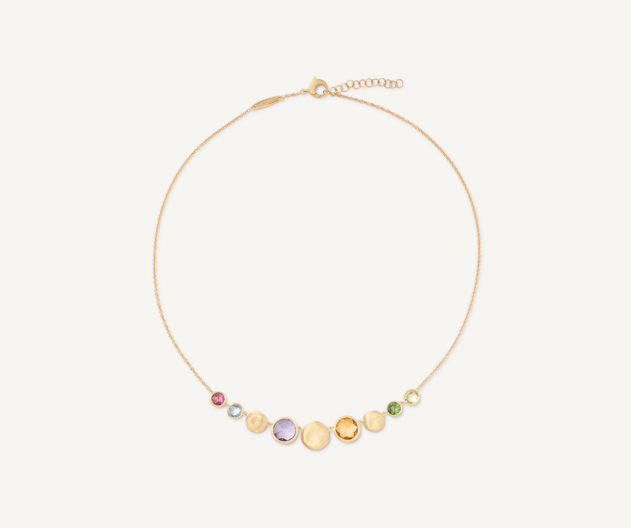 Light, elegant, mounted on a very light adjustable chain: like a wave of multicolored gems embellished with an 18kt yellow gold ring, finely hand-engraved with the ancient millerighe burin technique.