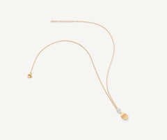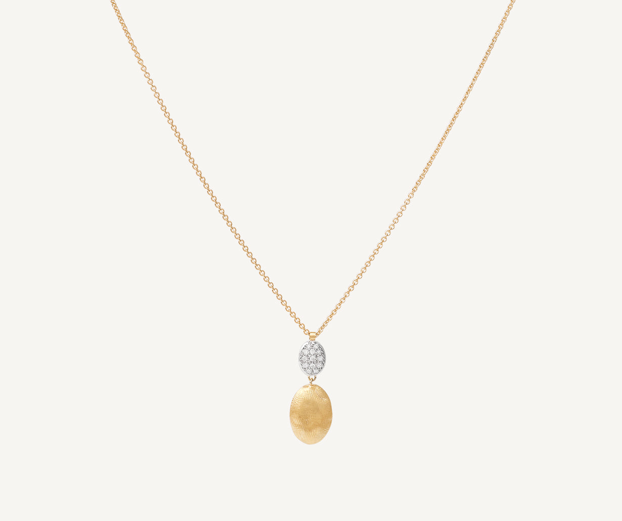 This 18kt gold necklace with an adjustable chain features a pendant with two oval elements, one having an irregular surface, finely hand-engraved using an ancient Florentine technique, and the other being embellished by a brilliant-cut diamond pav��. Adjustable closure.