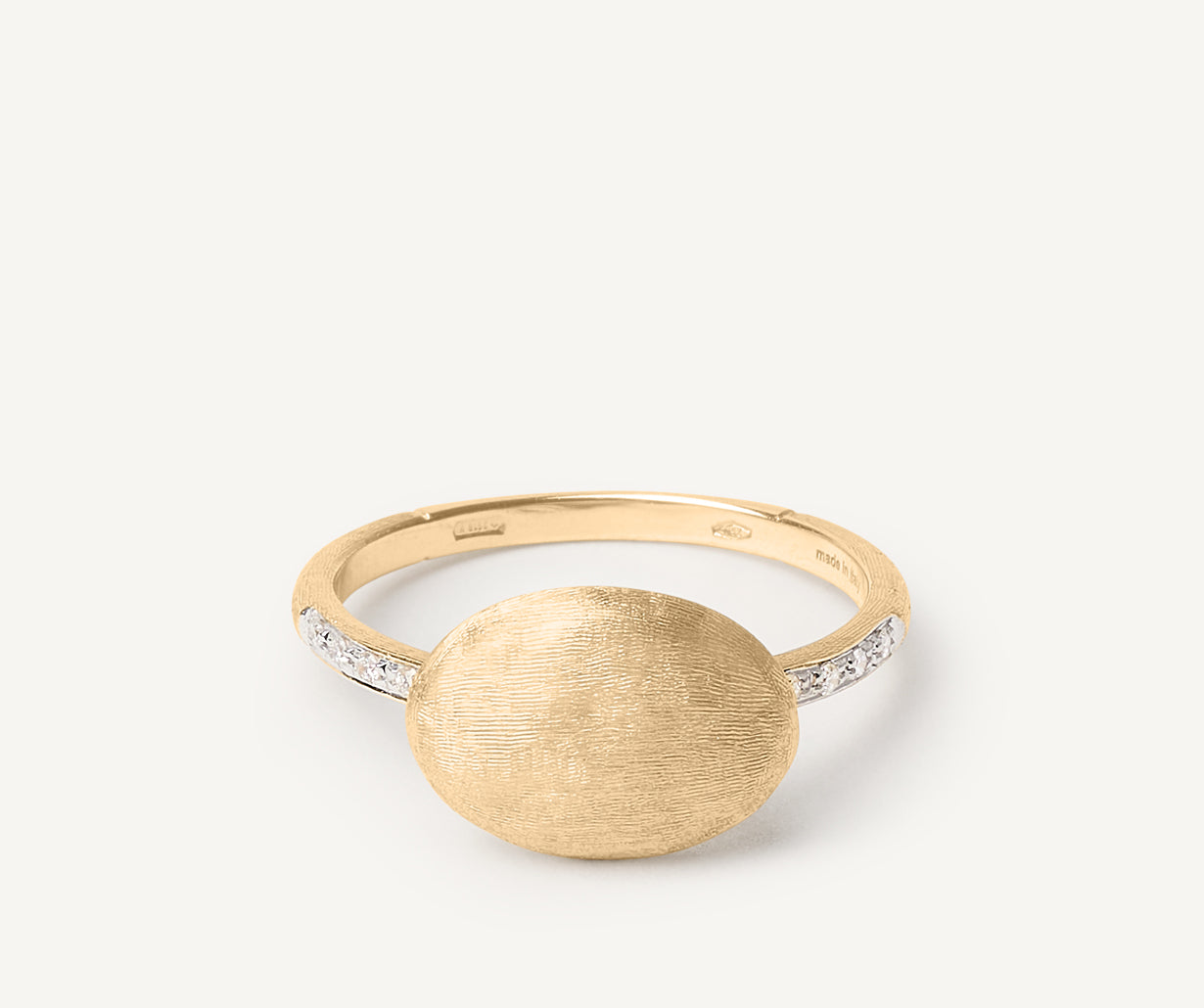 This delicate ring features a central oval element in 18kt yellow gold with an irregular surface, finely hand-engraved using an ancient Florentine technique. The shank is embellished by a selection of small brilliant-cut diamonds.