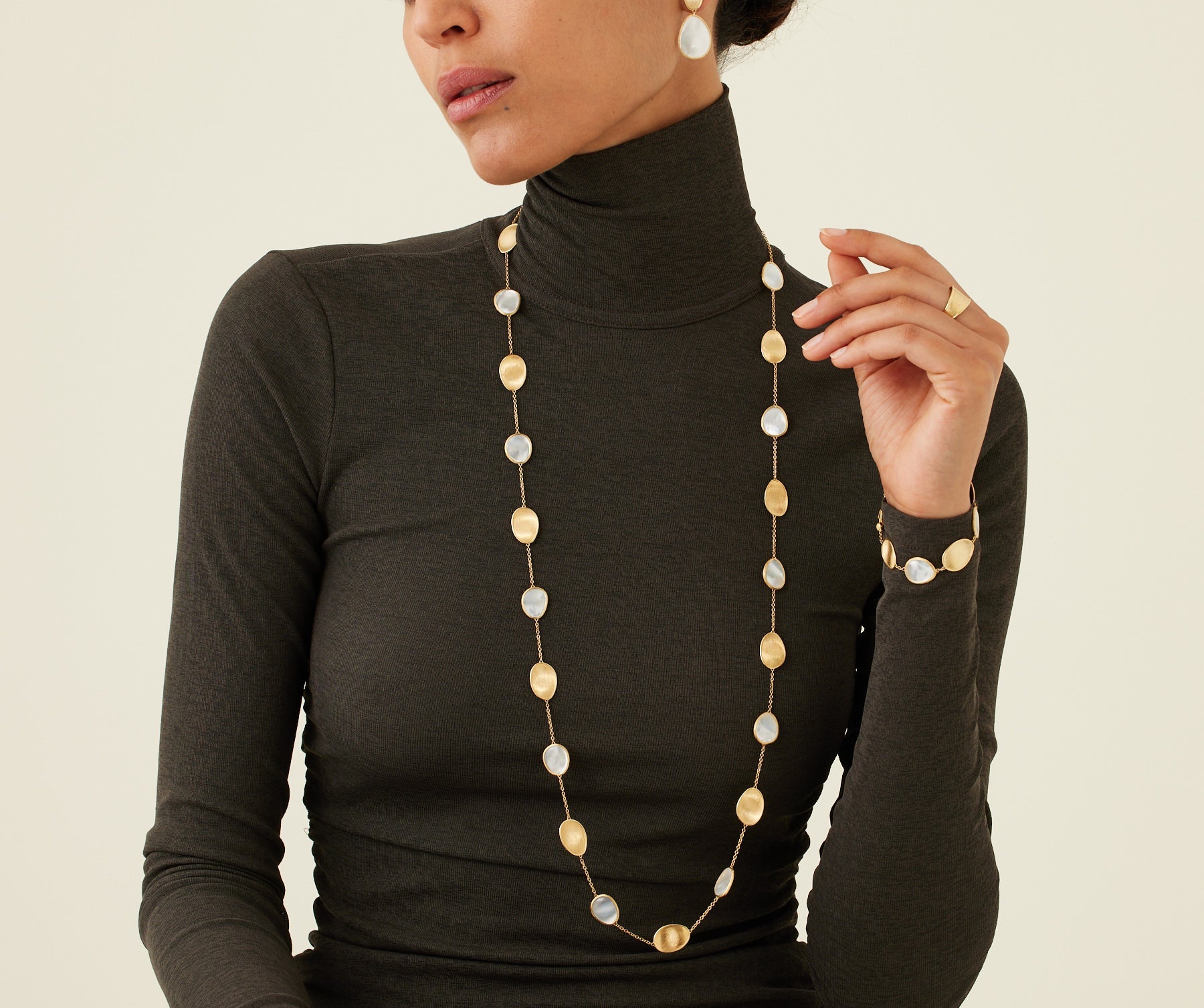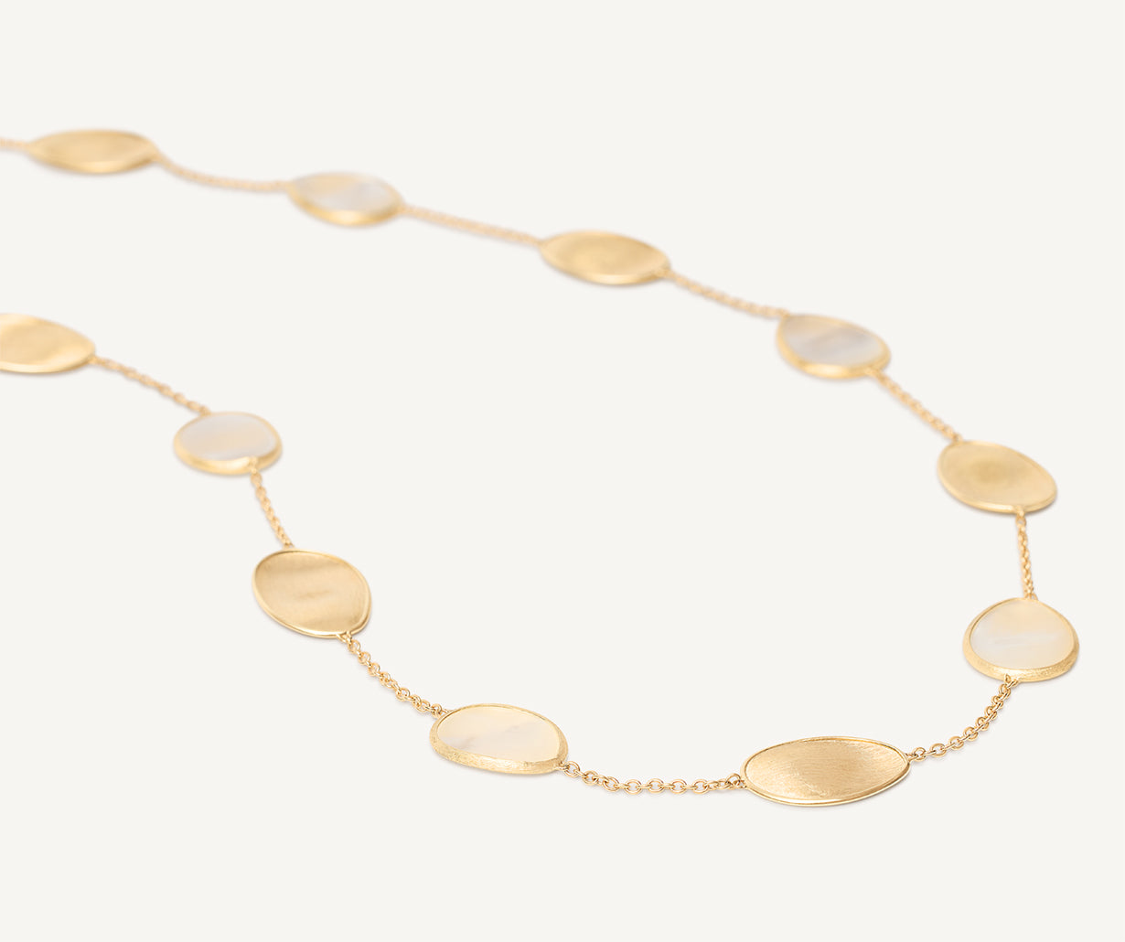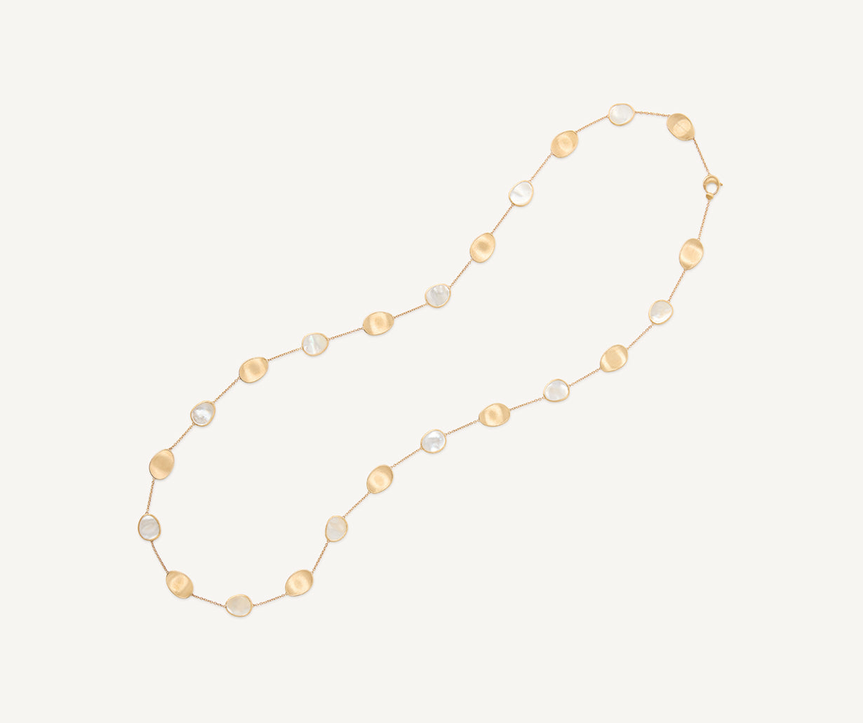 A refined sautoir in which light 18kt yellow gold leaves, finely hand-engraved with the ancient Florentine technique, are interspersed with petals of uniquely cut white mother-of-pearl. Perfect for making any occasion special, it can be worn in a very versatile way, long or doubled, to best suit every style need.